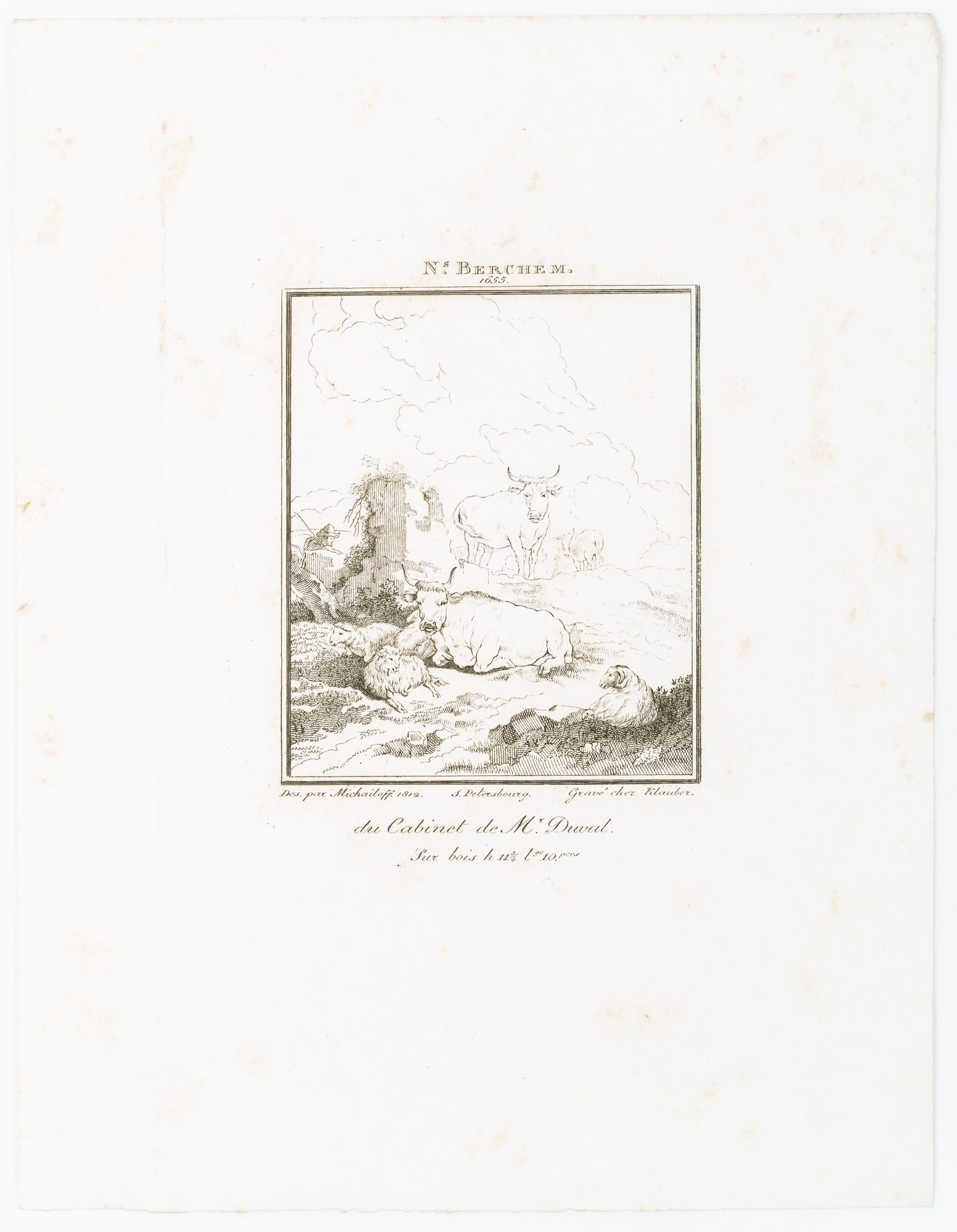 - Inscription: Signed and dated below the image in the printing plate “Des. par Michailoff 1812 / S. Petersbourg / Gravé chez Klauber”, inscribed below centre “du cabinet de Mr. Duval”. Inscribed above the image “Berchem 1655”.