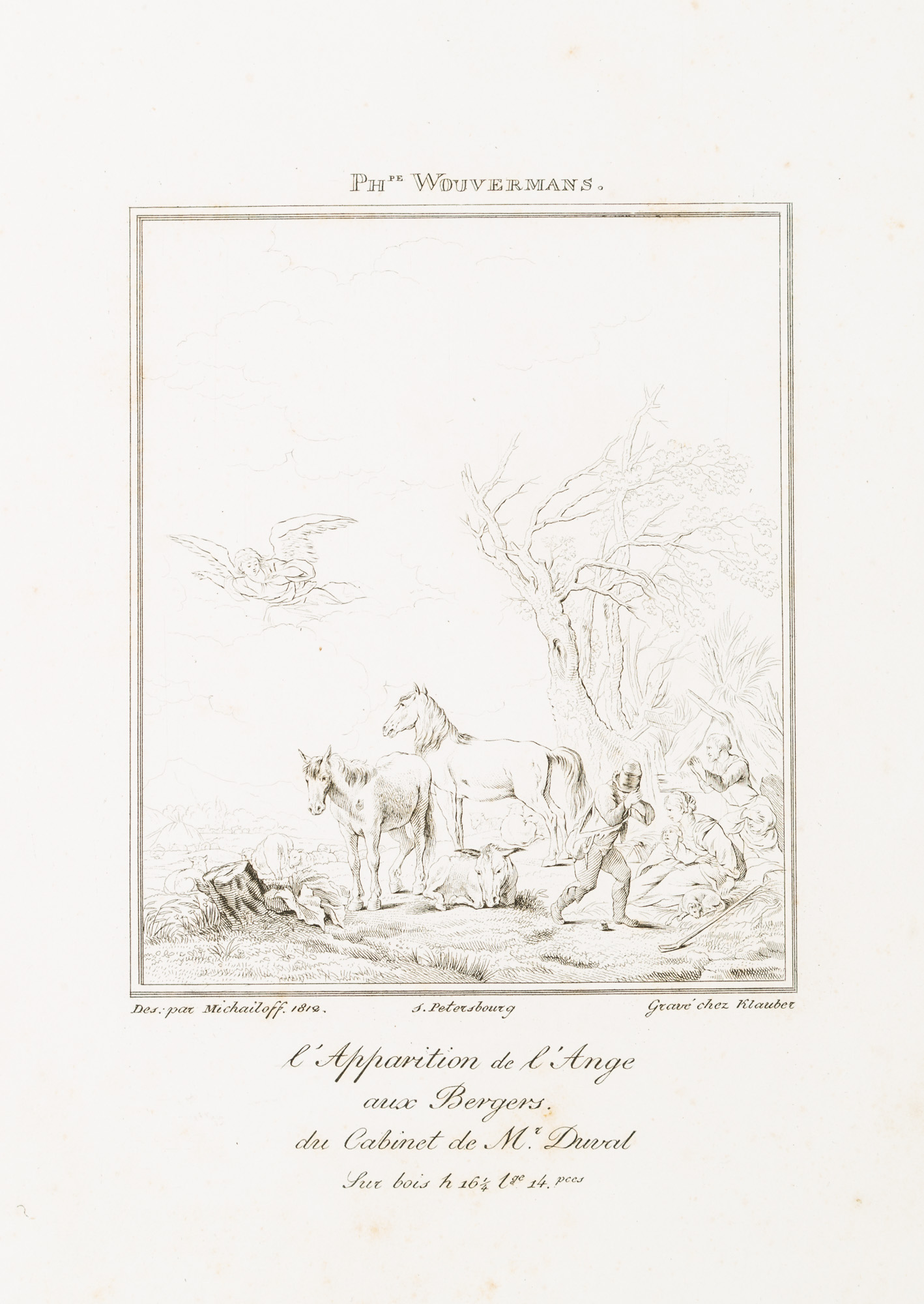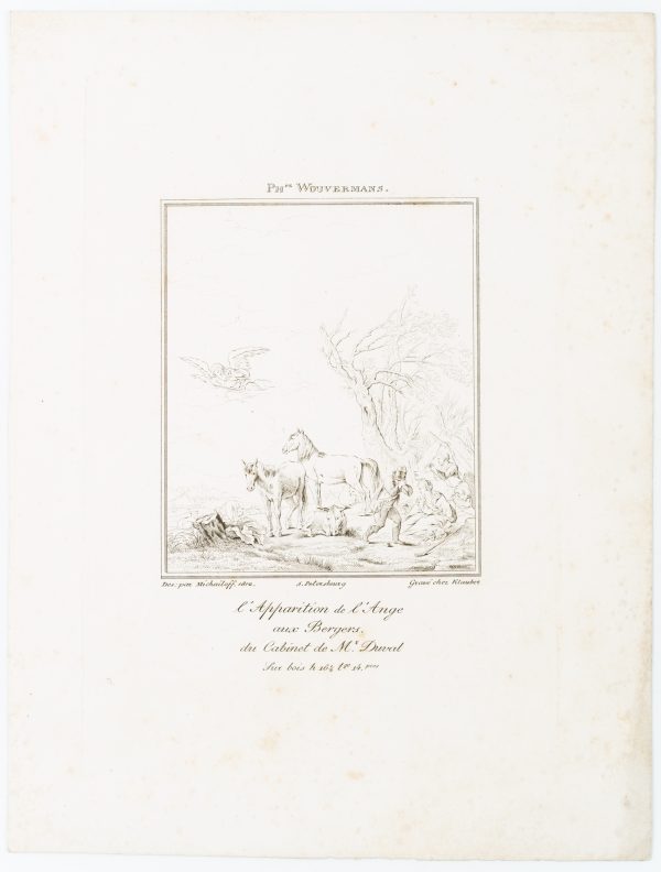 - Inscription: Signed and dated below the image in the printing plate “Des. par Michailoff 1812 / S. Petersbourg/ Gravé chez Klauber”, inscribed below centre “L’Apparition de l’Ange / aux Bergers / du Cabinet de Mr. Duval”. Inscribed above the image “Ph. Wouwermans.