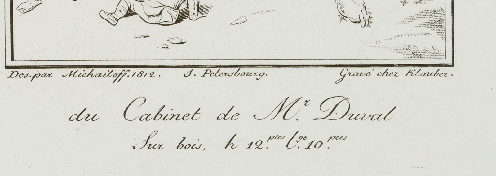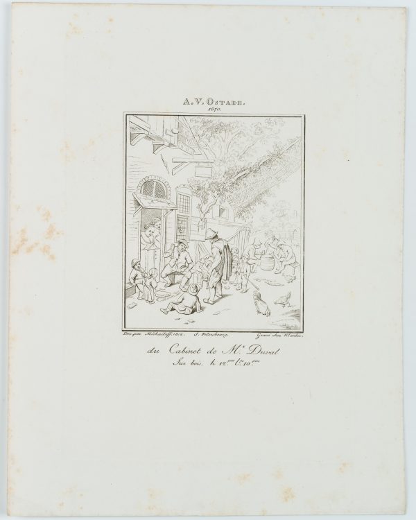 - Inscription: Typographically titled, inscribed and dated below the image: “Des. par Michailoff 1812. / S. Petersbourg / Gravé chez Klauber. / du Cabinet de Mr. Duval / Sur bois…”. Inscribed above the image: “A. V. OSTADE. 1670.”.