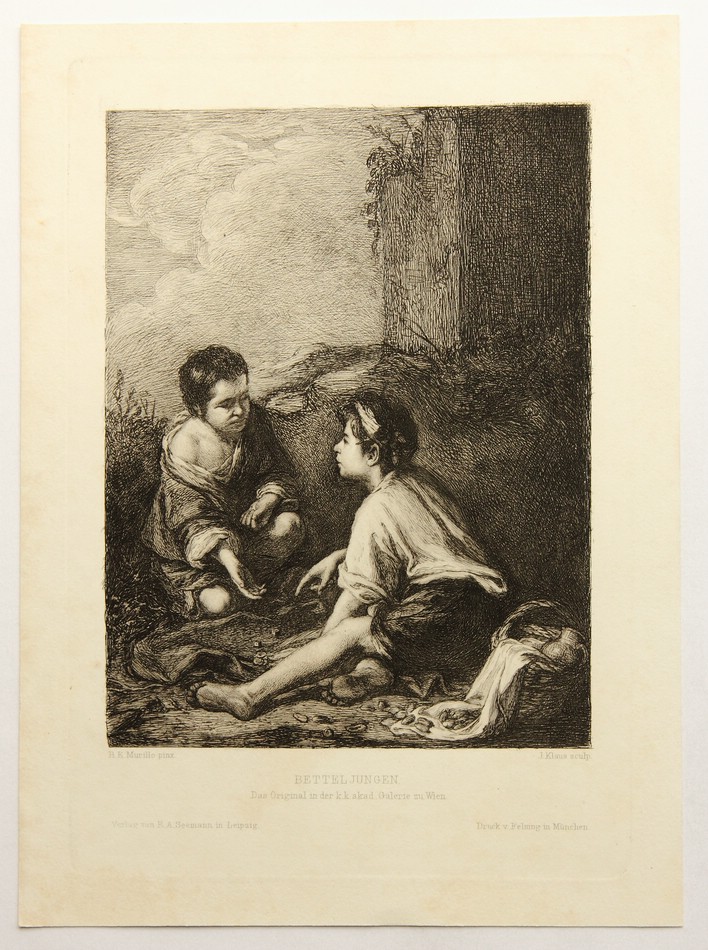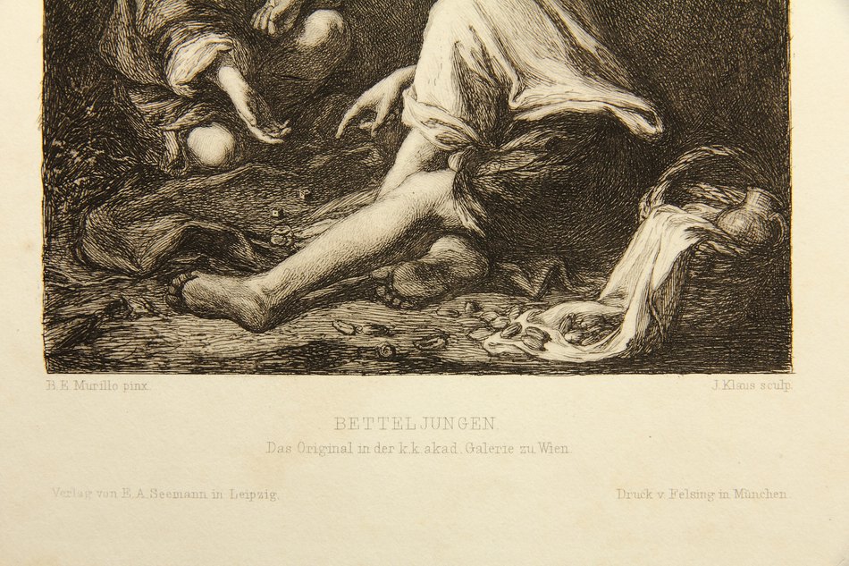 - Inscription: Signed and inscribed in the printing plate below the image: “B. E. Murillo pinx. | J. Klaus sculp. | Beggar boys. The original in the k.k. akad. Galerie zu Wien | Verlag von E.A. Seemann. Leipzig | printed by Fr. Felsing. Munich”.