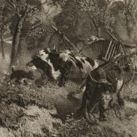 Johannes Klaus (1847 Wien – 1893 ebd.) nach Teutwart Schmitson (1830 Frankfurt am Main – 1863 Wien), Stürzende Kutsche mit scheuenden Ochsen, um 1870, Radierung