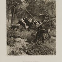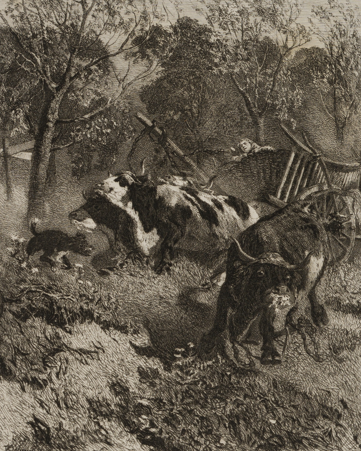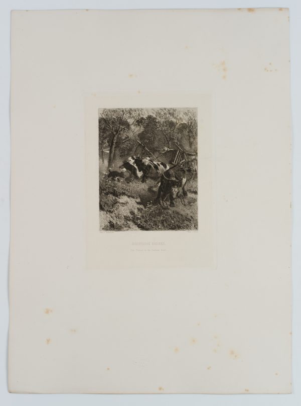 Johannes Klaus (1847 Vienna – 1893 ibid.) after Teutwart Schmitson (1830 Frankfurt on the Main – 1863 Vienna), Falling carriage with shying oxen, c. 1870, Etching