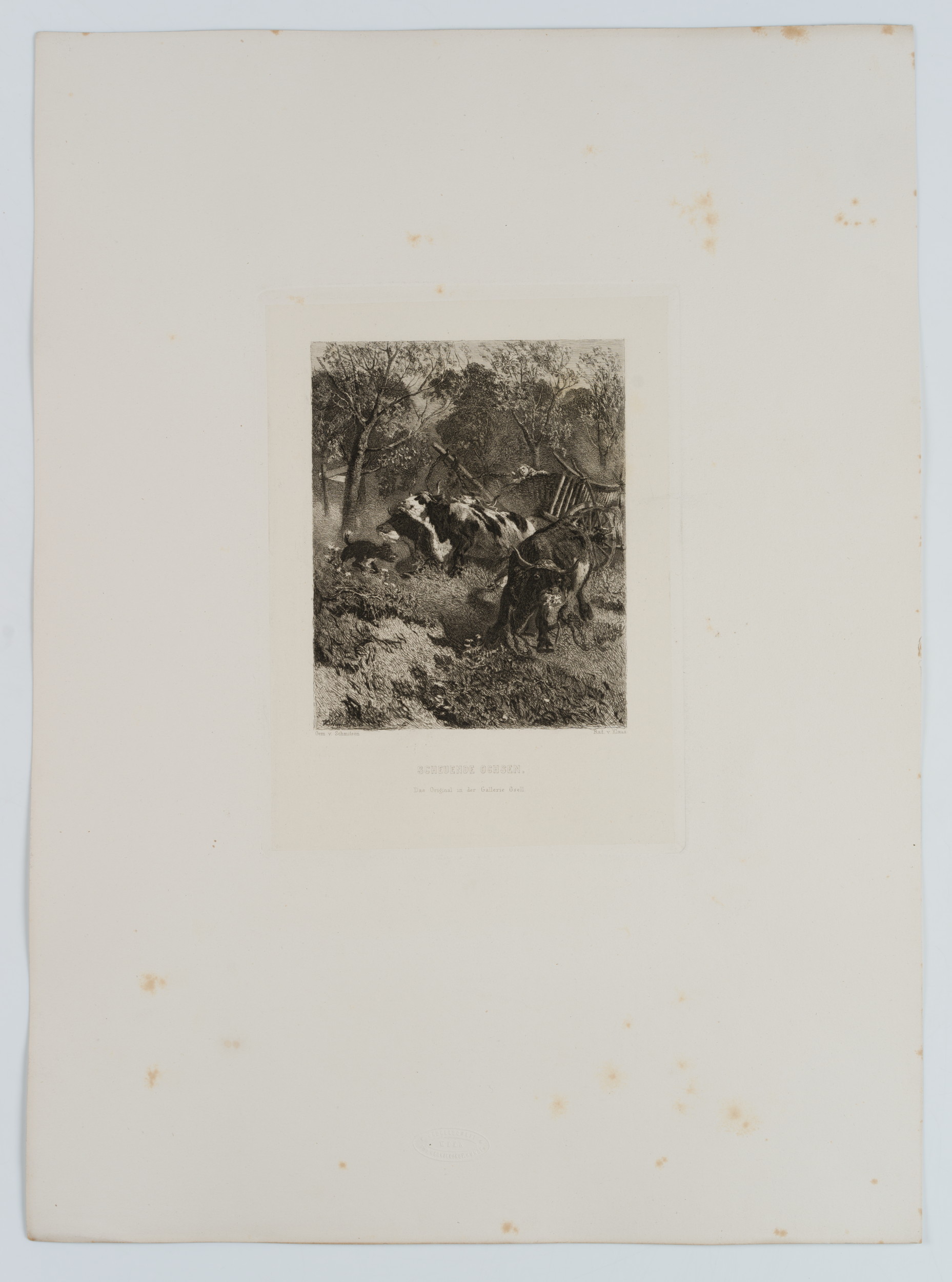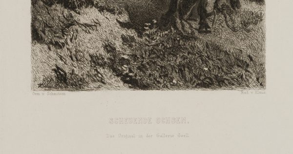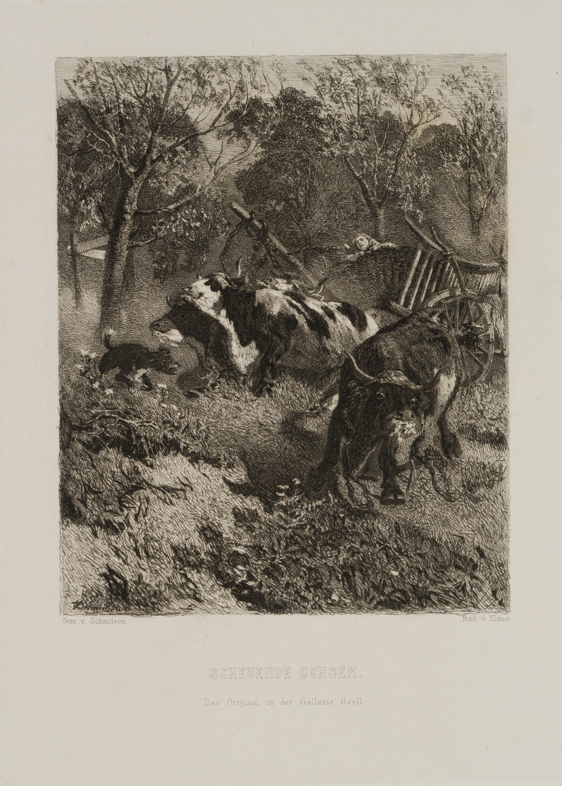 - Inscription: Lower middle signed in the printing plate: “Gem v. Schmitson | Rad. v Klaus”. Lower middle inscribed in the printing plate: “Scheuende Ochsen. Das Original in der Gallerie Gsell”.