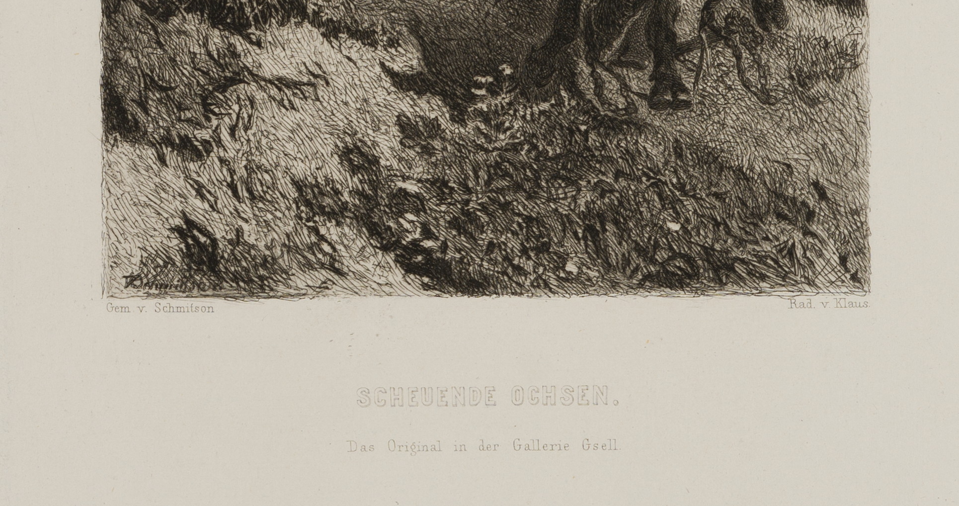 - Bezeichnung: Unten mittig im Druck signiert: “Gem v. Schmitson | Rad. v Klaus”. Unten mittig im Druck bezeichnet: “Scheuende Ochsen. Das Original in der Gallerie Gsell”.