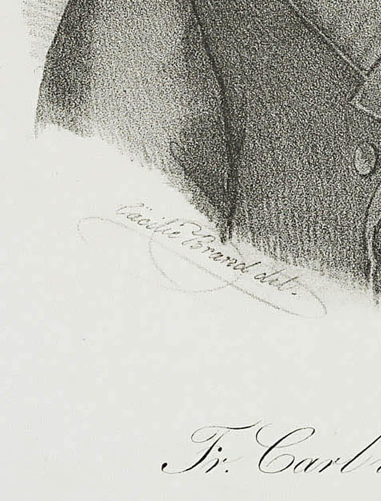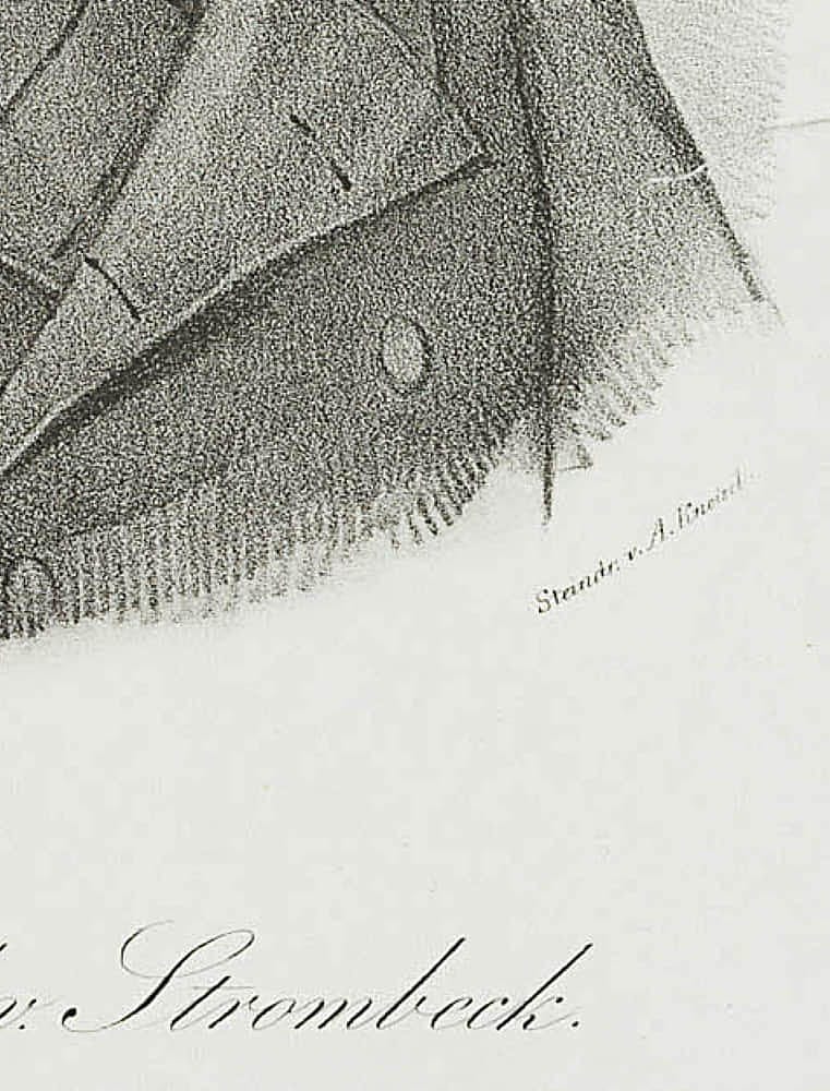 - Bezeichnung: Links unter dem Bild mit “Cäcilie Brand del.” und “A. Kneisel.” signiert. Darunter befindet sich der Name des dargestellten “Fr. Carl v. Strombeck.”.