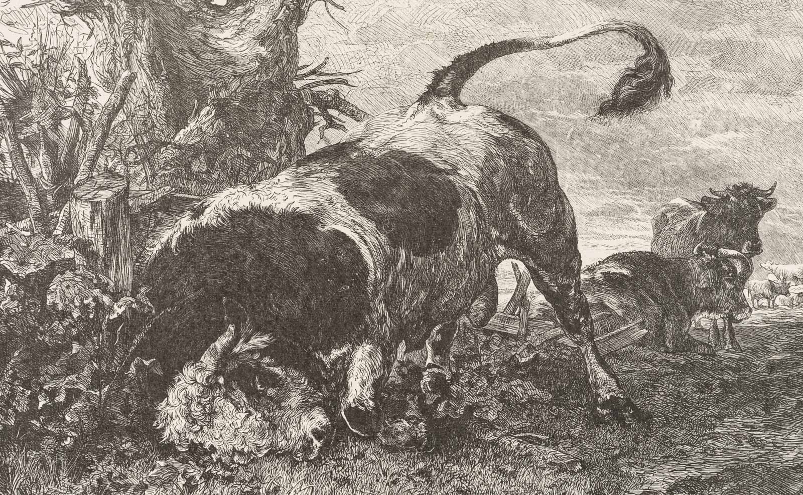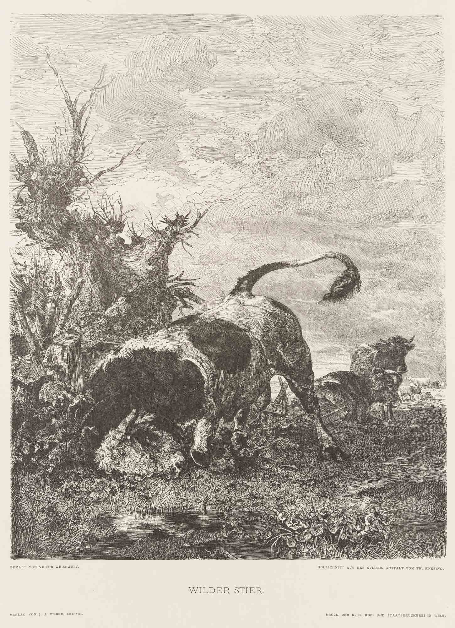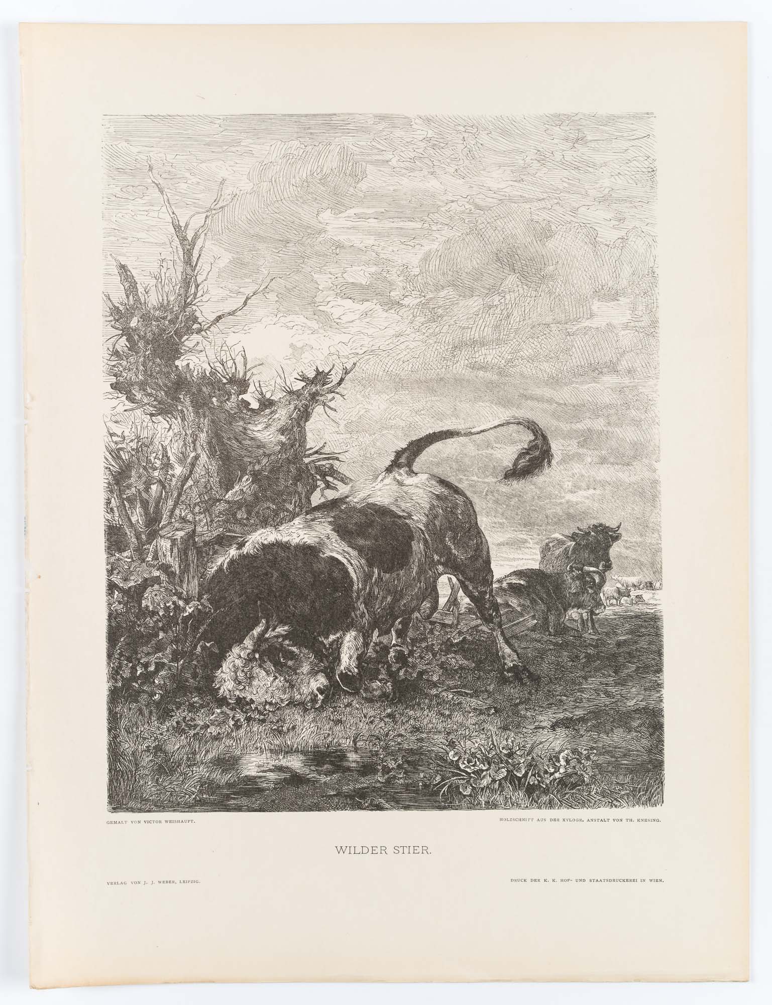 Theodor Knesing (1840 Leipzig – um 1927 München) nach Victor Weishaupt (1848 München – 1905 Karlsruhe), Tierdarstellung, Wilder Stier auf der Weide, 19. Jahrhundert, Reproduktion