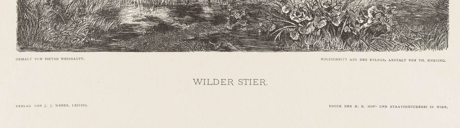 - Inscription: Signed “Weishaupt München” in the lower left corner of the image. Below again signed in block letters “GEMALT VON VICTOR WEISHAUPT.”, on the right signed in block letters “HOLZSCHNITT AUS DER XYLOGR. ANSTALT BY TH. KNESING.”, inscribed below.