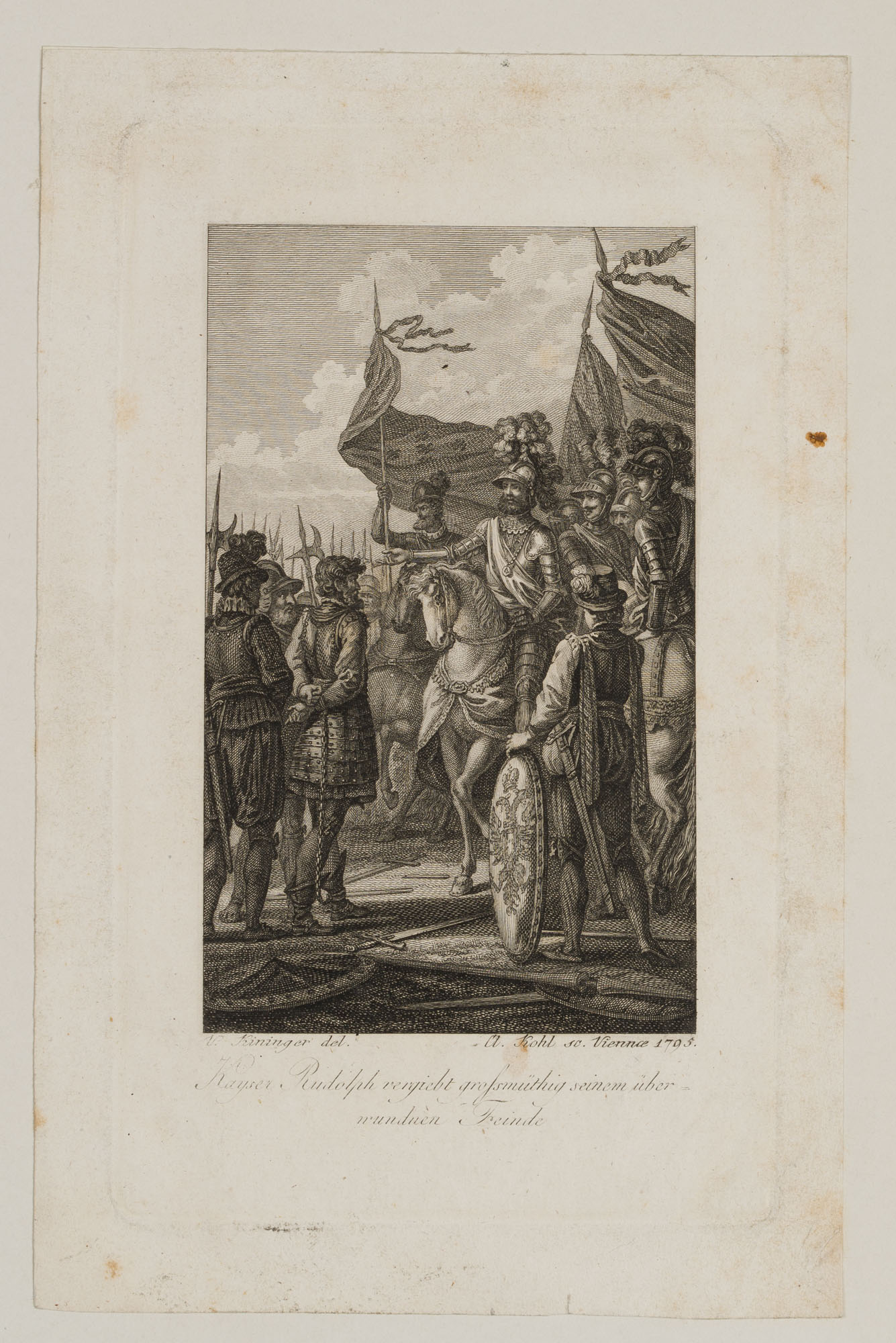 - Inscription: Signed below left and right, below with caption: “Kayser Rudolph vergiebt grossmüthig seinem überwundnen Feinde”.