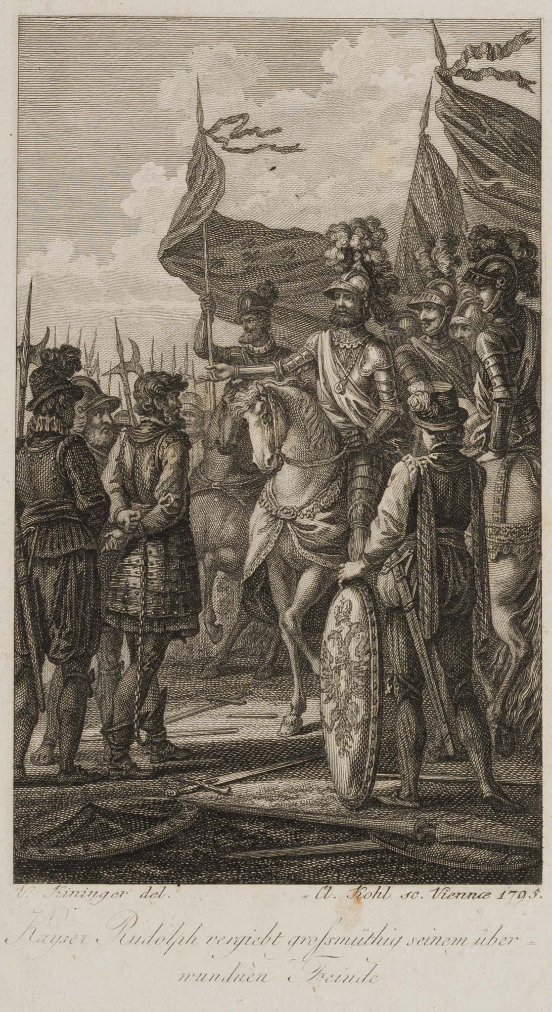 Clemens Kohl (1754 Prag – 1807 Wien) nach Vincenz Georg Kininger (1767 Regensburg – 1851 Wien), ‘Kaiser Rudolph vergibt großmütig seinem überwundenen Feind’, Buchillustration, 18. Jahrhundert, Kupferstich