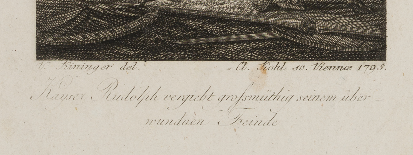 - Bezeichnung: Unterhalb links und rechts signiert, darunter mit Bildunterschrift: “Kayser Rudolph vergiebt grossmüthig seinem überwundnen Feinde”.