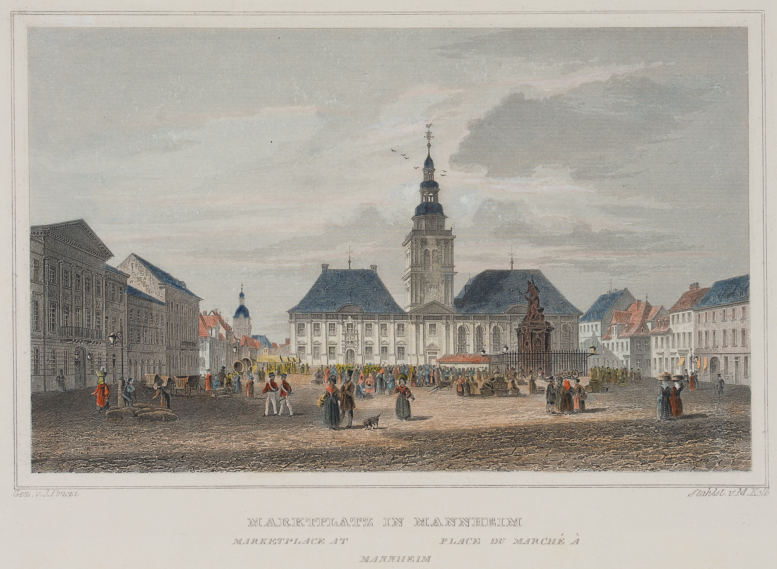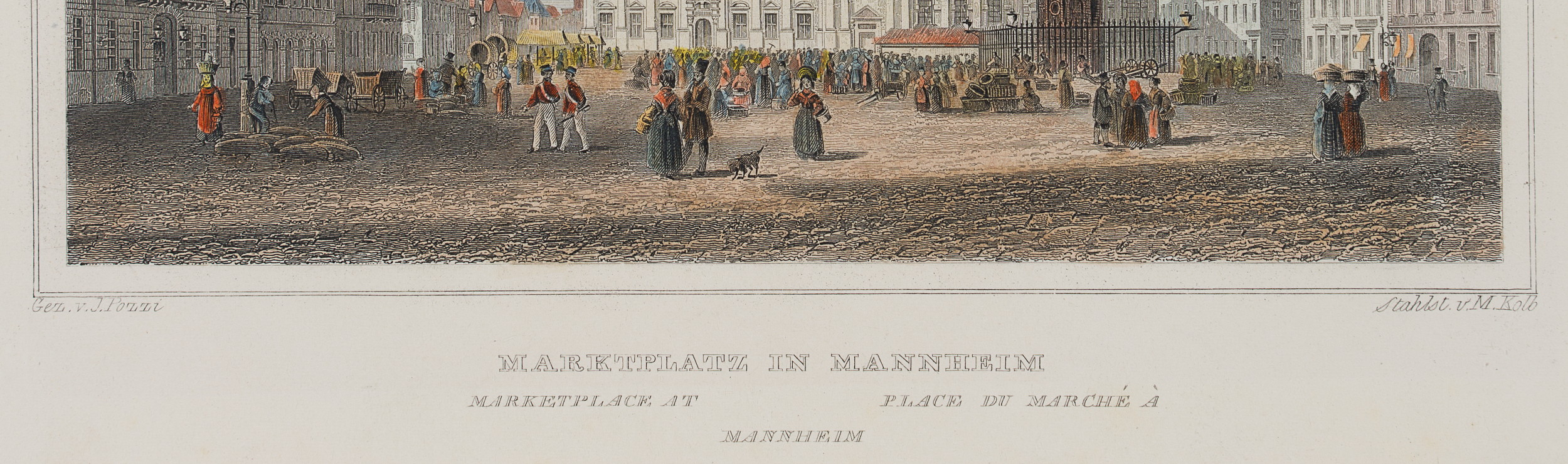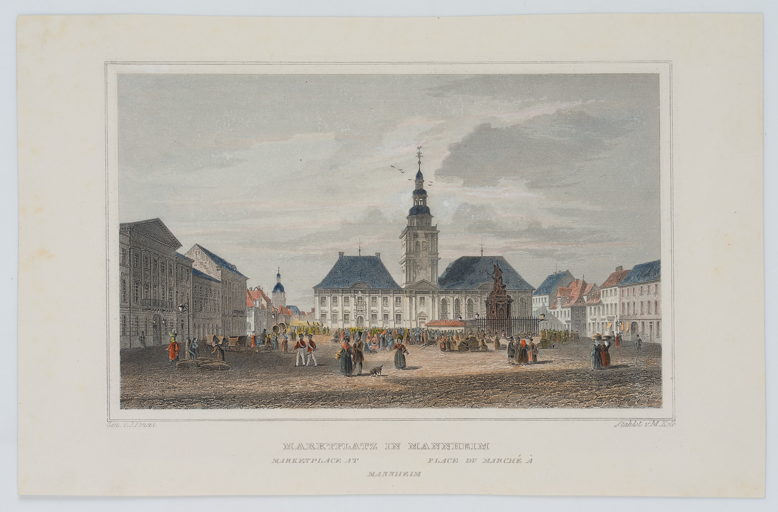 - Bezeichnung: Unten im Druck signiert: “Gez. v. J. Pozzi | Stahlst. v. M. Kolb”. Unten im Druck bezeichnet: “Marktplatz in Mannheim | Marketplace at Mannheim | Place du Marché à Mannheim”.