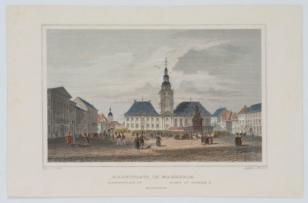- Inscription: At the lower part signed in the printing plate: “Gez. v. J. Pozzi | Stahlst. v. M. Kolb”. At the lower part inscribed in the printing plate: “Marktplatz in Mannheim | Marketplace at Mannheim | Place du Marché à Mannheim”.
