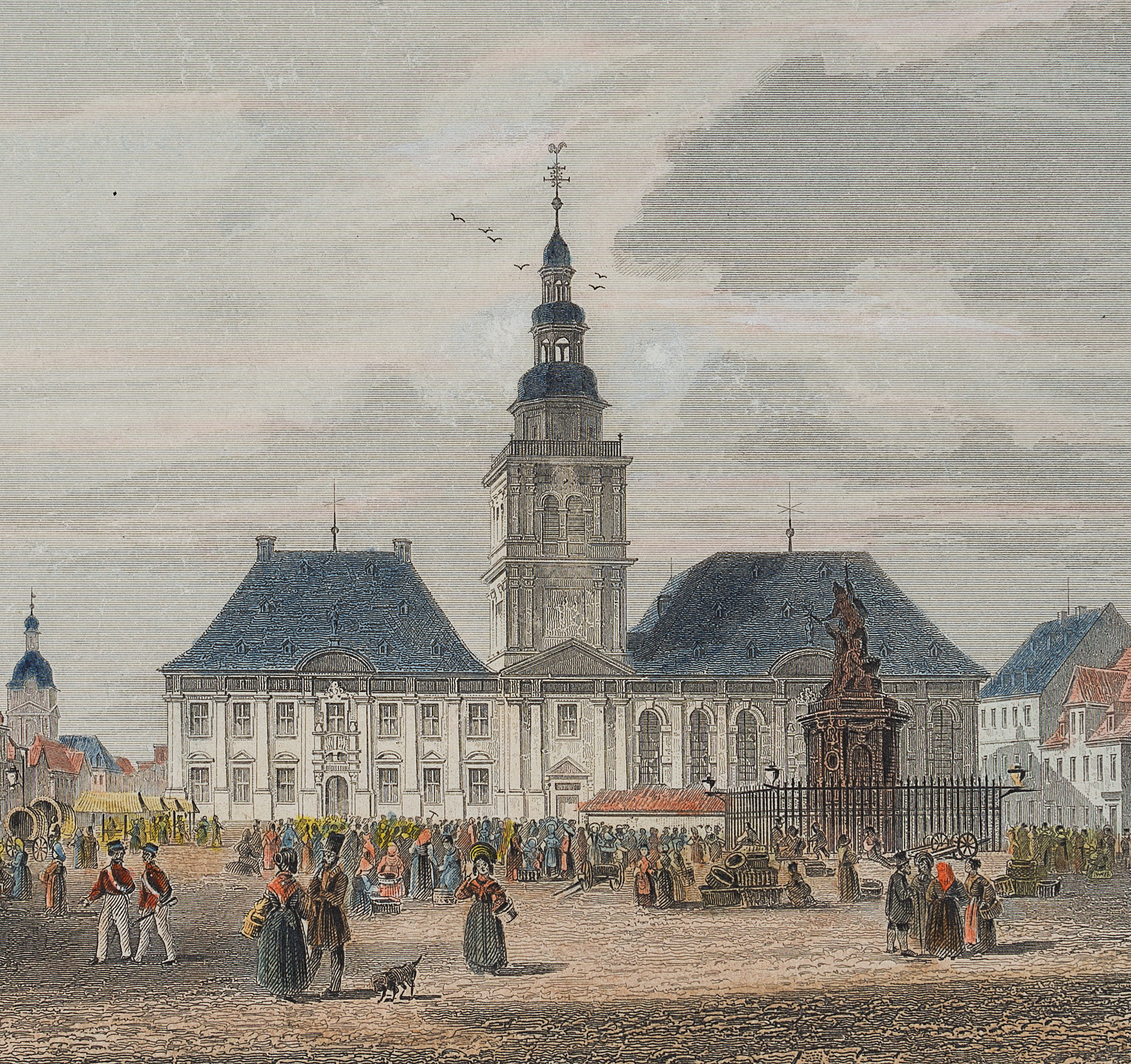 Joseph Maximilian Kolb (before 1818 – after 1859 ) after Giacomo Pozzi (1814 Mannheim – 1897 Köthen), Market place in Manheim, 19th century, Steel engraving