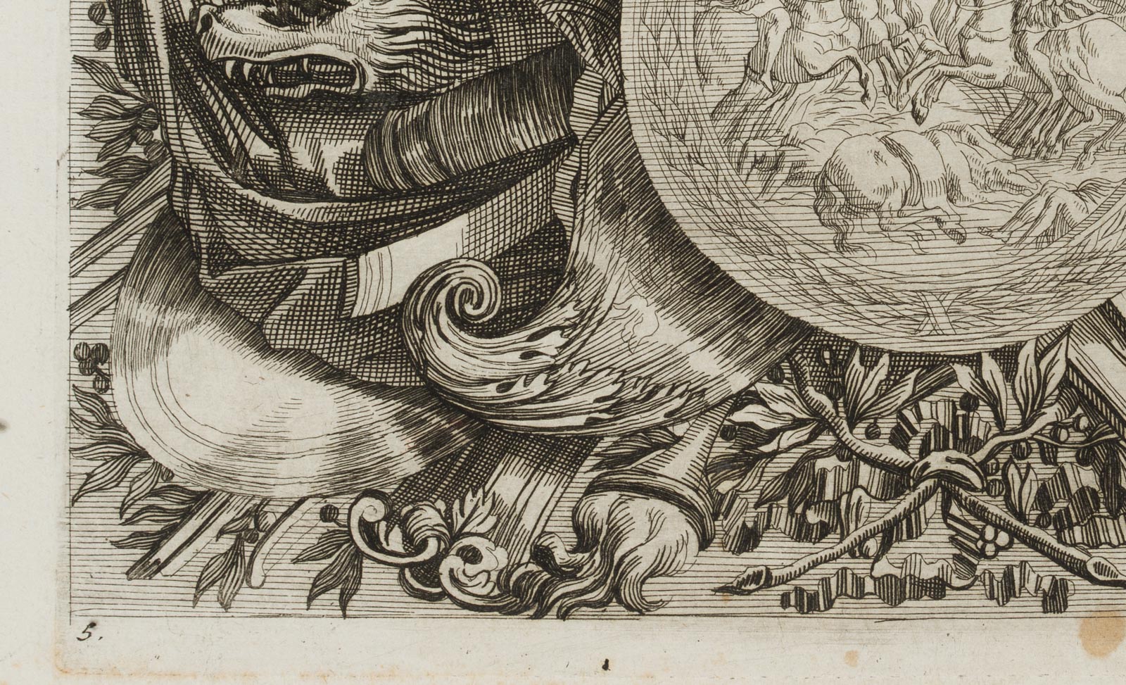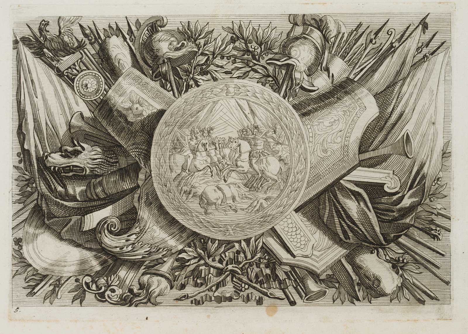 Johann Ulrich Kraus (1655 Augsburg – 1719 ) after Jean Lepautre (1618 Paris – 1682 ibid.), Triumphal sign, weapon bundle and medallion, c. 1690, Etching