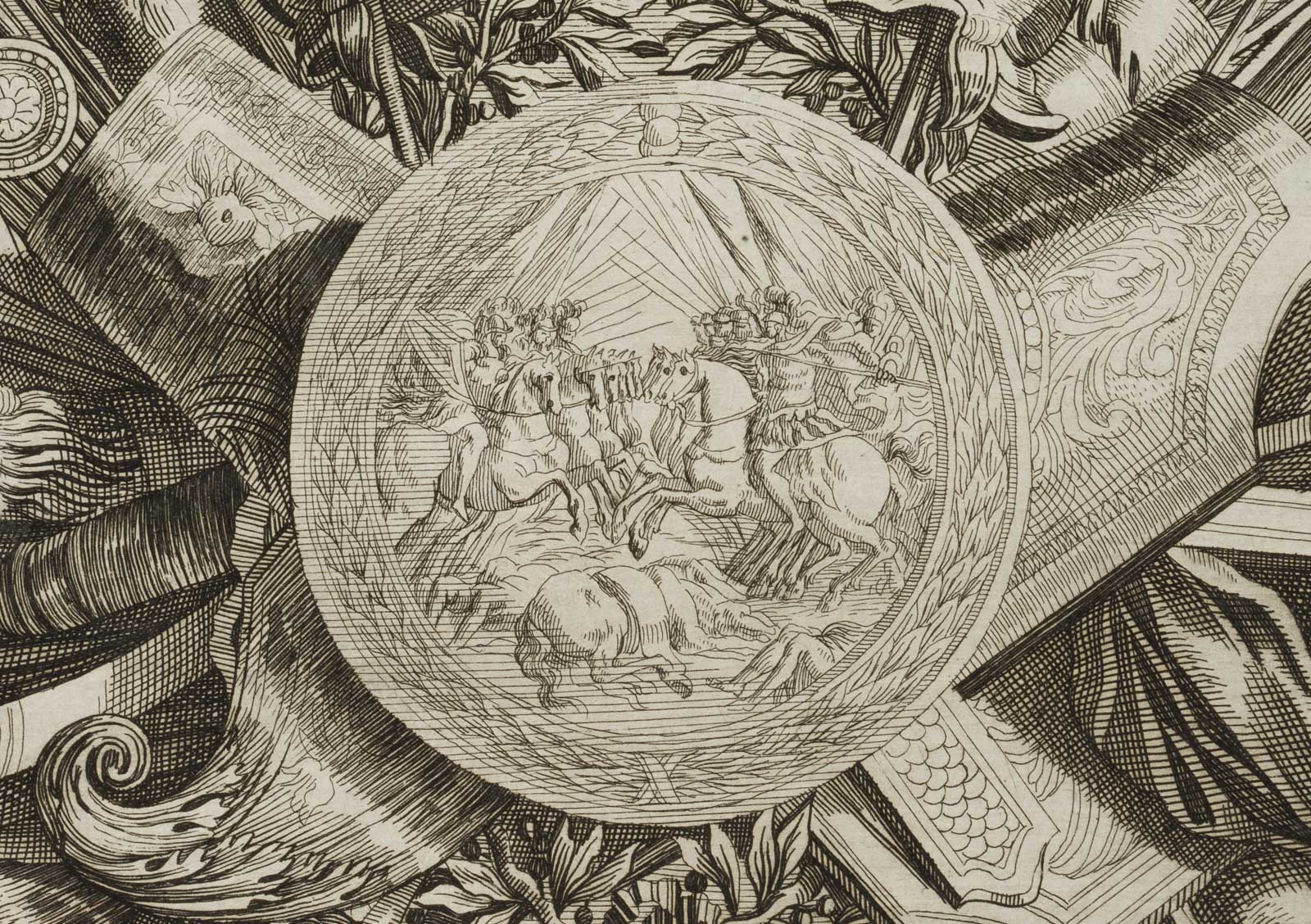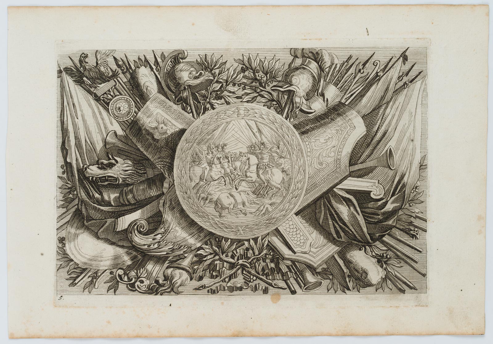 Johann Ulrich Kraus (1655 Augsburg – 1719 ) nach Jean Lepautre (1618 Paris – 1682 ebd.), Triumphzeichen, Waffenbündel und Medaillon, um 1690, Radierung