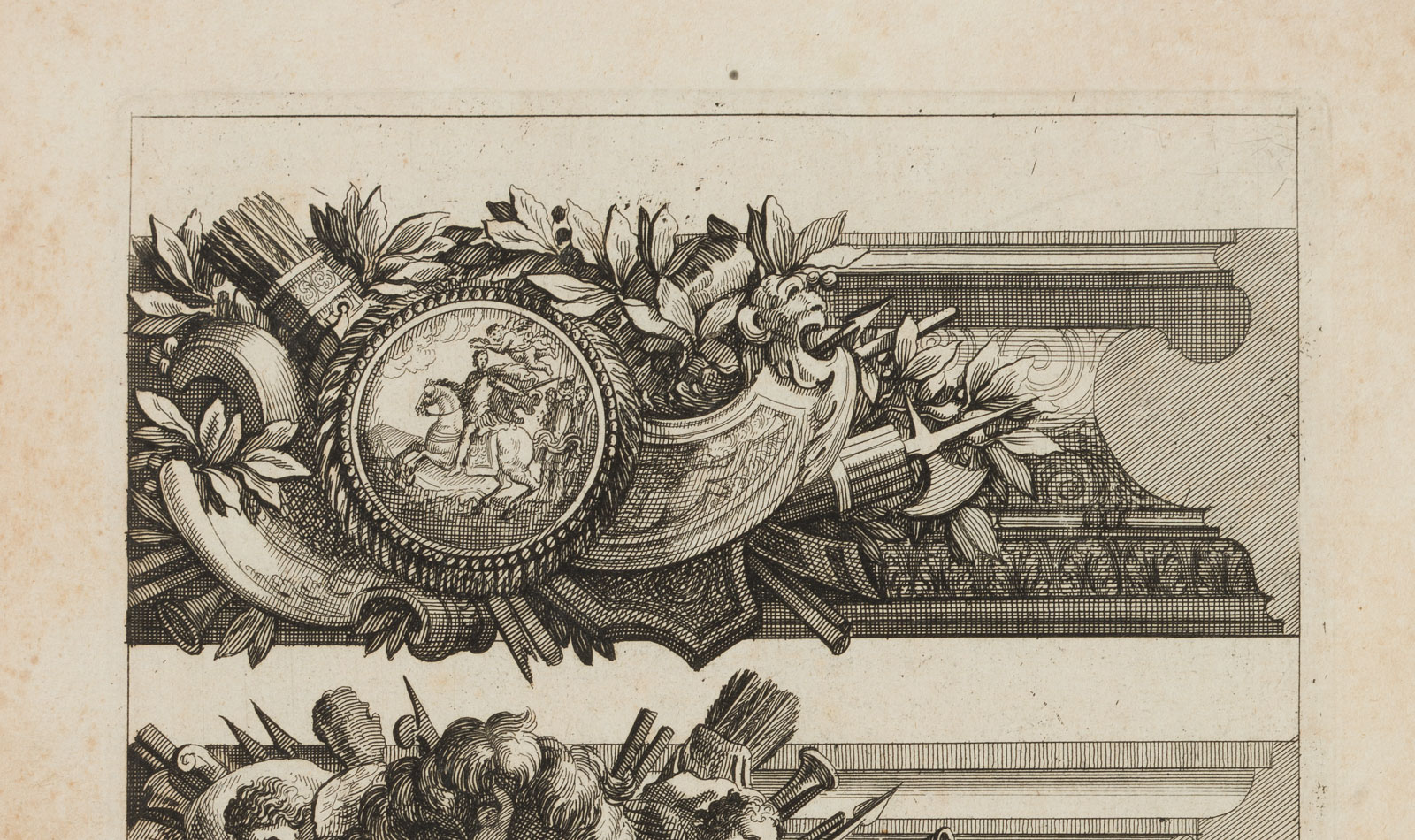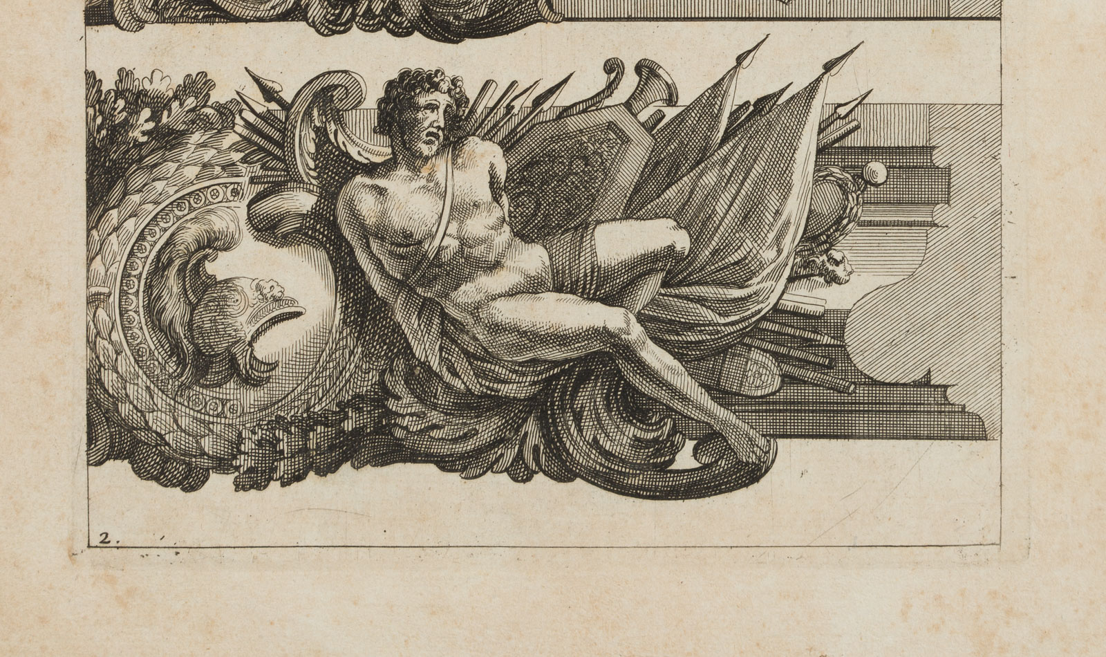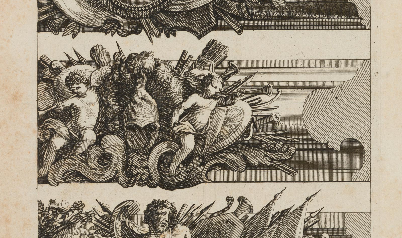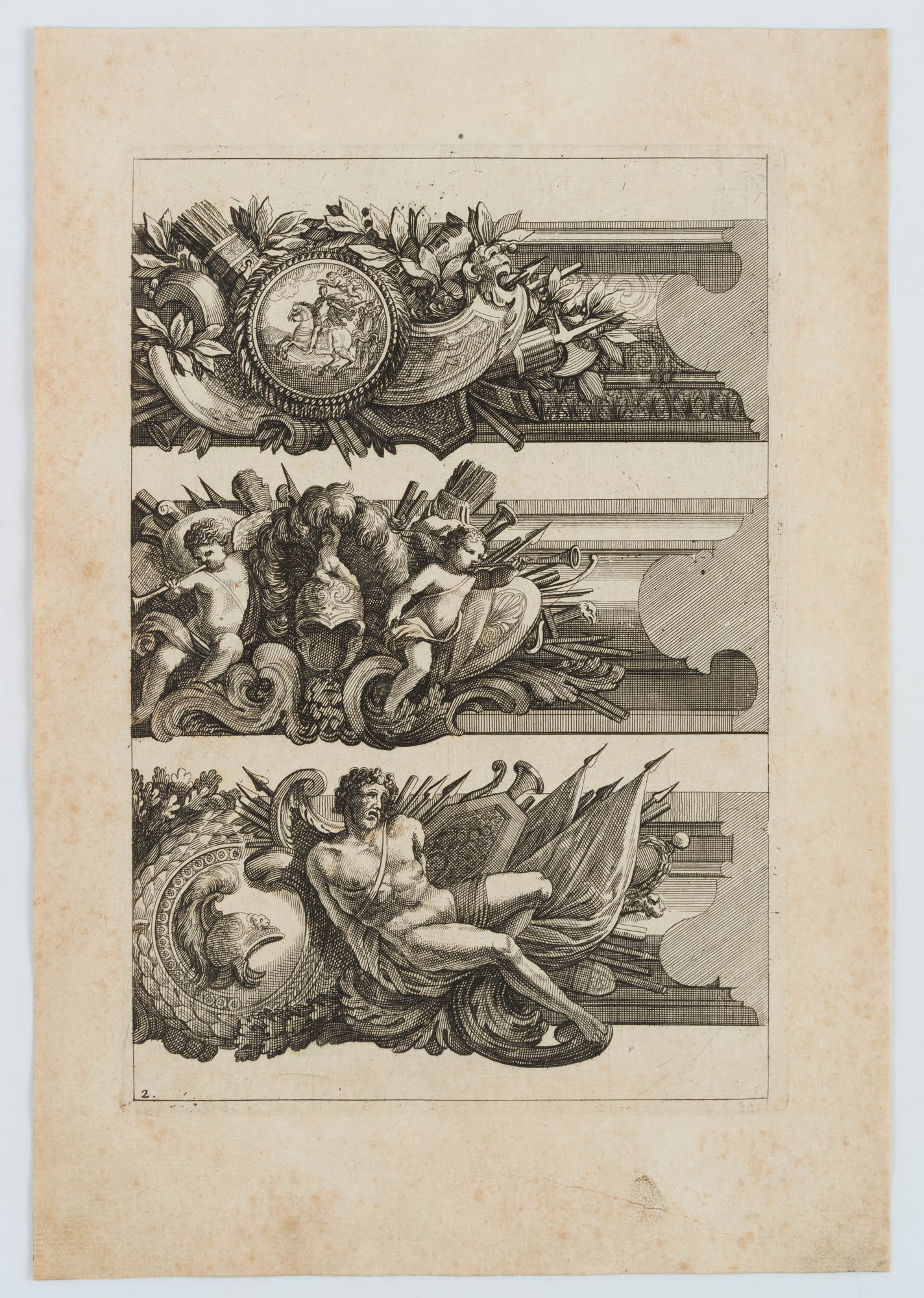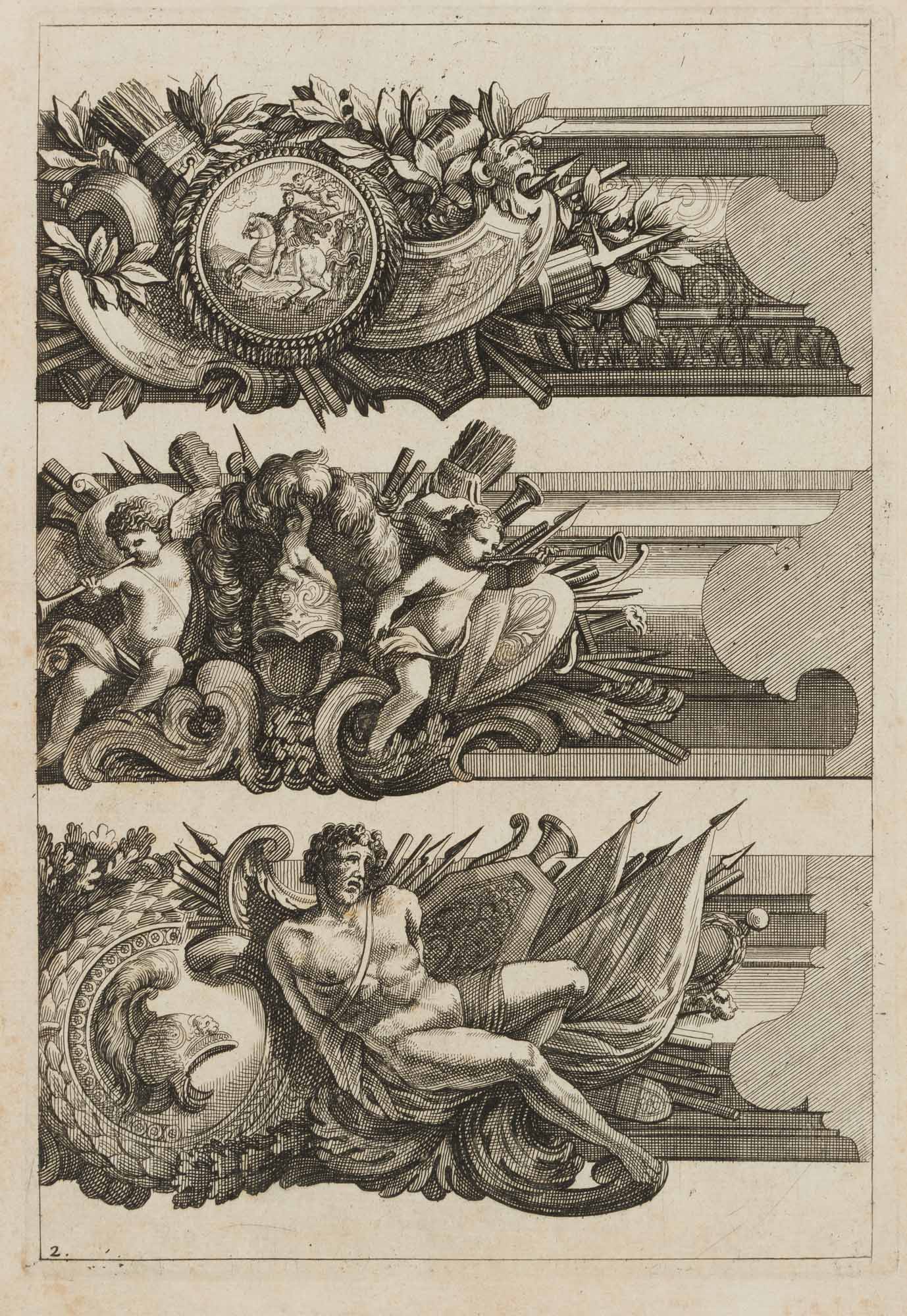 Johann Ulrich Kraus (1655 Augsburg – 1719 ) after Jean Lepautre (1618 Paris – 1682 ibid.), Signs of Triumph, Bundles of Arms and Slaves, c. 1690, Etching
