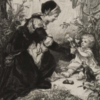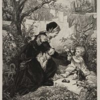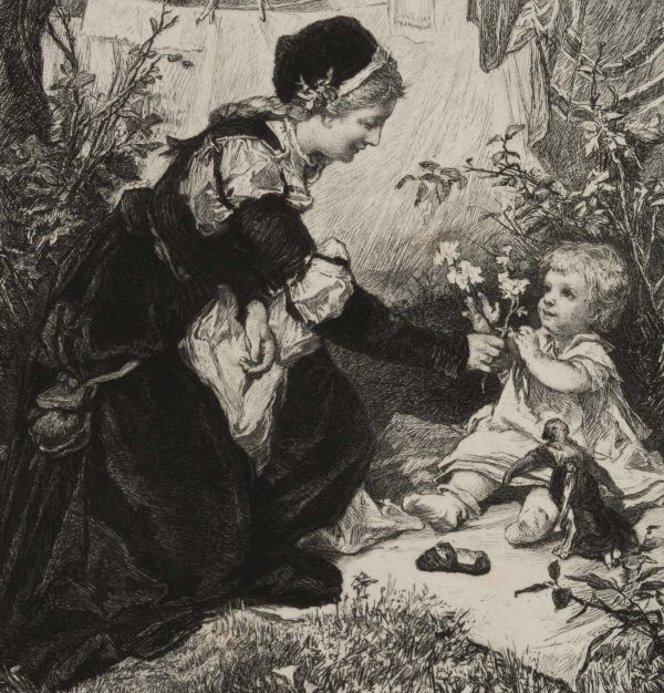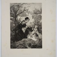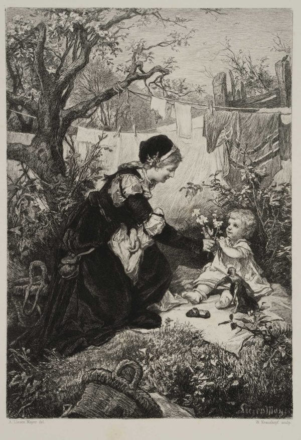 Wilhelm Krauskopf (1847 – 1899 ) nach Alexander von Liezen-Mayer (1839 – 1898 ebd.), Liebevolle Szene mit Mutter und Kind im Garten beim Trocknen der Wäsche, 19. Jahrhundert, Lithographie