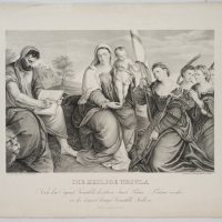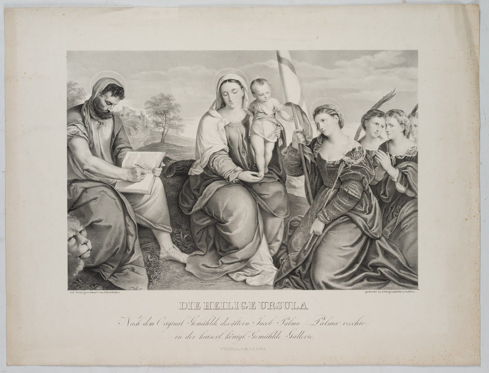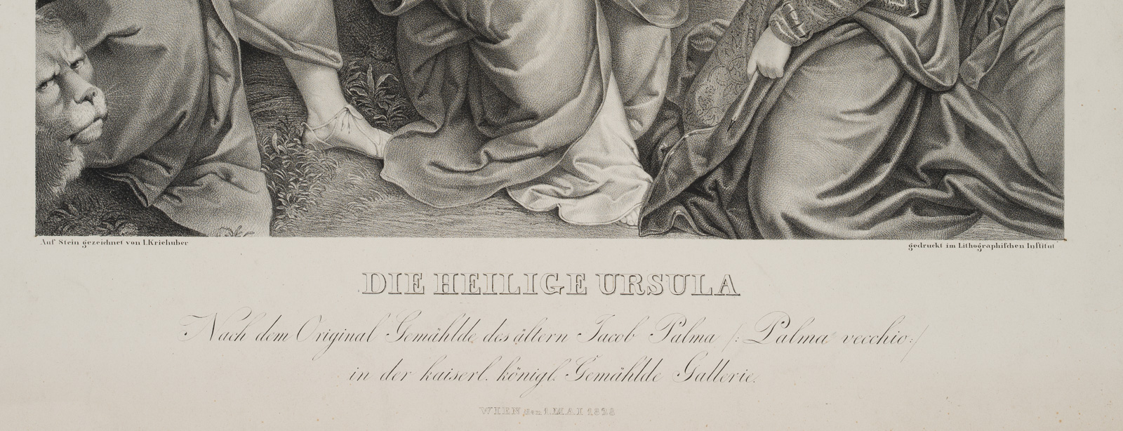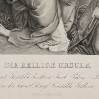 - Bezeichnung: Unterhalb der Darstellung links signiert, darunter der Titel: “Die Heilige Ursula. Nach dem Gemählde des ältern Jacob Palma / Palma vecchio / in der kaiserl. königl. Gemählde Gallerie. Wien dem 1. Mai 1828”. Entgegen der Angabe auf dem vorliegenden Blatt ist laut Boetticher (vgl. Friedrich von Boetticher Malerwerke des 19. Jahrhunderts, Hofheim/Taunus 1979, Bd. II,1, S.354, Nr. 2.) das Original Gemälde ein Werk des Künstlers Johann Matthias RANFTL.
