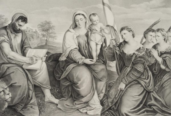 - Schlagworte: Heilige, Heiligendarstellung, Madonna, Maria, Marienbildnis, Mutter, Christus, Jesus, Jesuskind, Ursula, Markus, Evangelist, Apostel, Markuslöwe, Löwe, Jungfrauen, Religiös, Landschaft, Österreich, Renaissance, 1800-1849