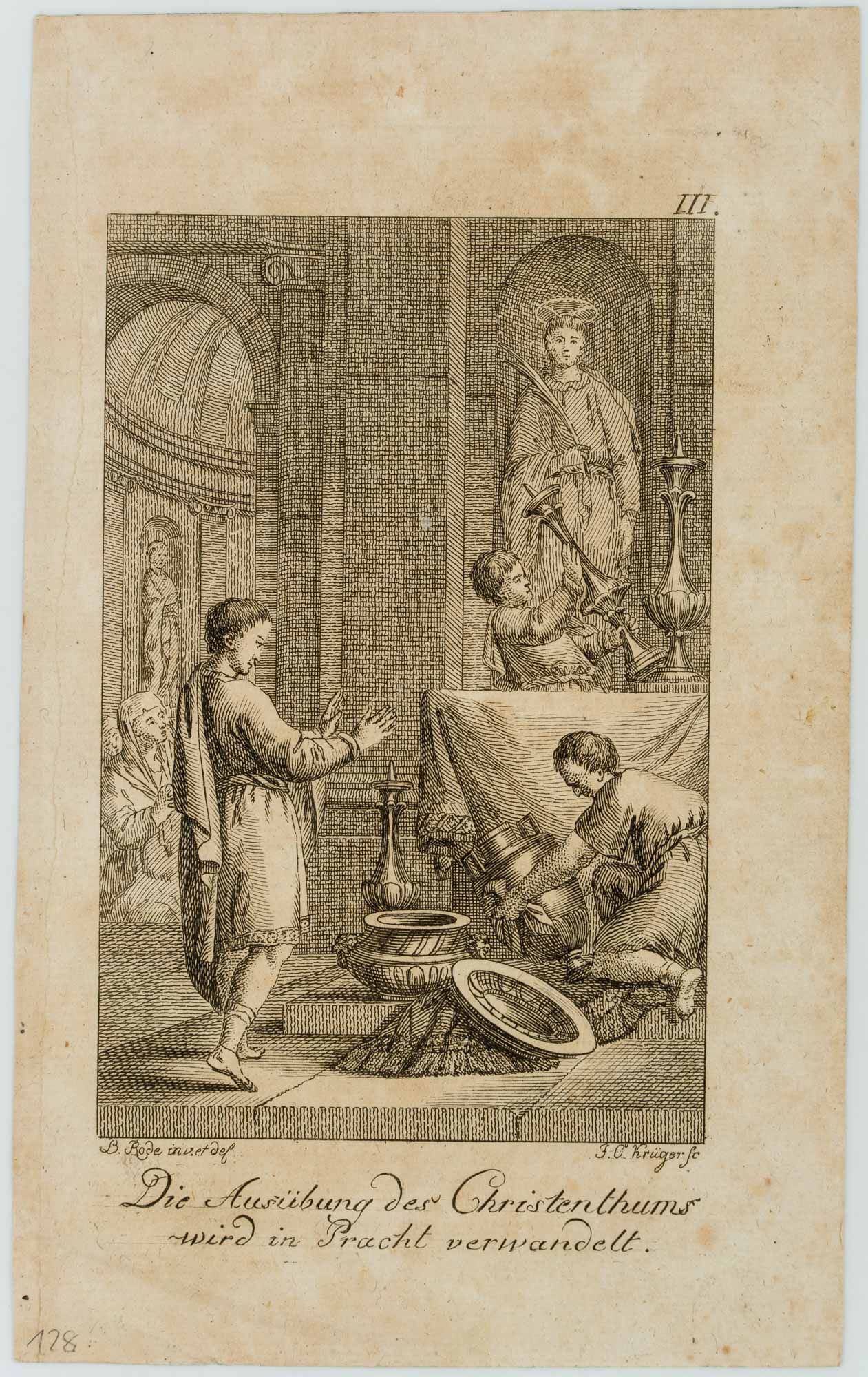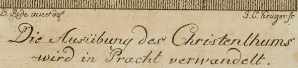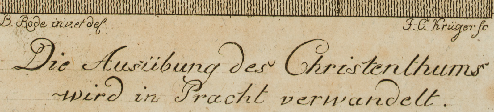 - Bezeichnung: Unterhalb der Darstellung links bezeichnet: “B. Rode inv: et del.” und “F. C. Krüger sc.”, darunter betitelt “Die Ausübung des Christenthums wird in Pracht verwandelt.”; oben rechts nummeriert “III.”.
