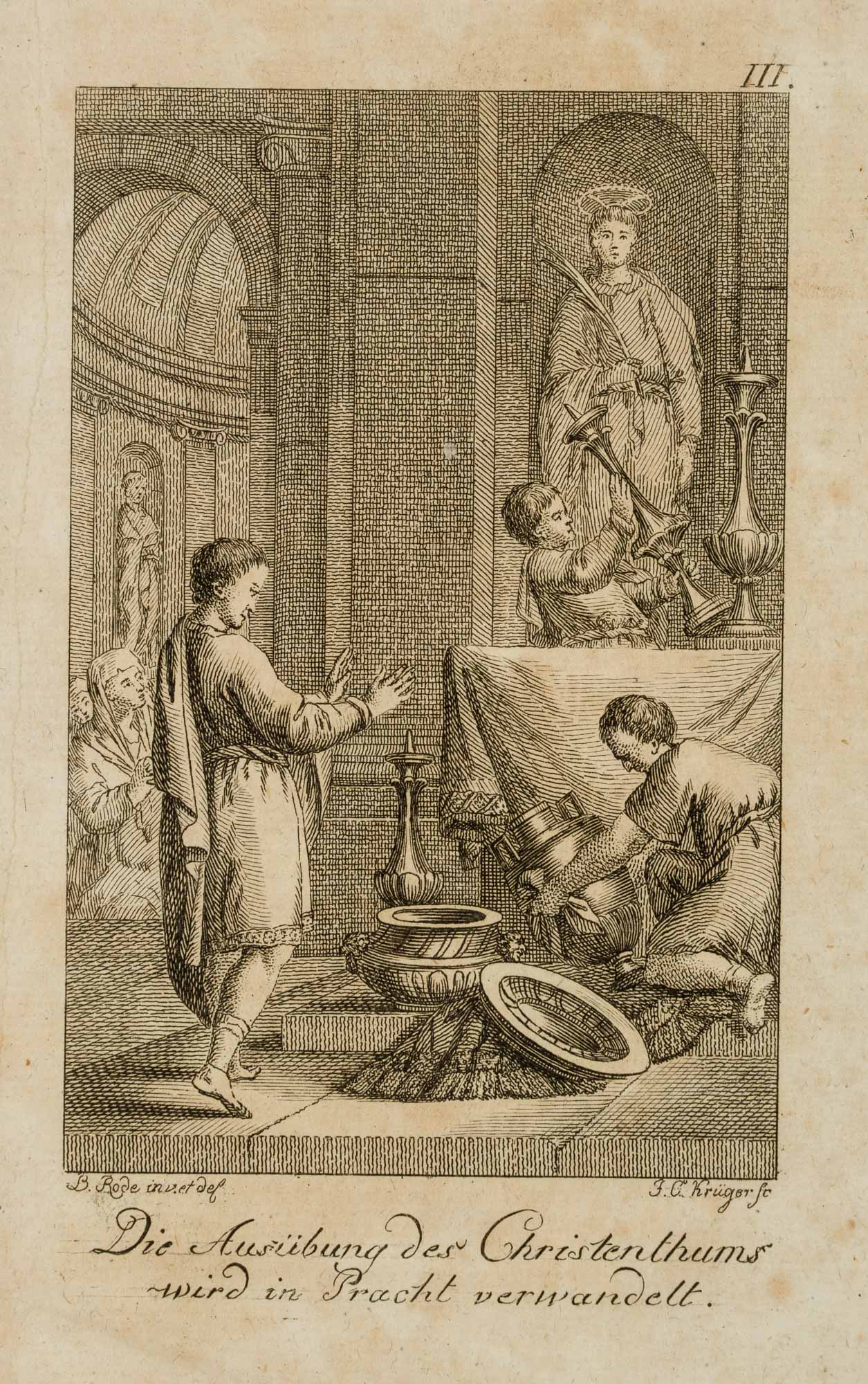 - Inscription: Inscribed below the image on the left: “B. Rode inv: et del.” and “F. C. Krüger sc.”, titled below “Die Ausübung des Christenthums wird in Pracht verwandelt.”; numbered “III.” on the upper right.