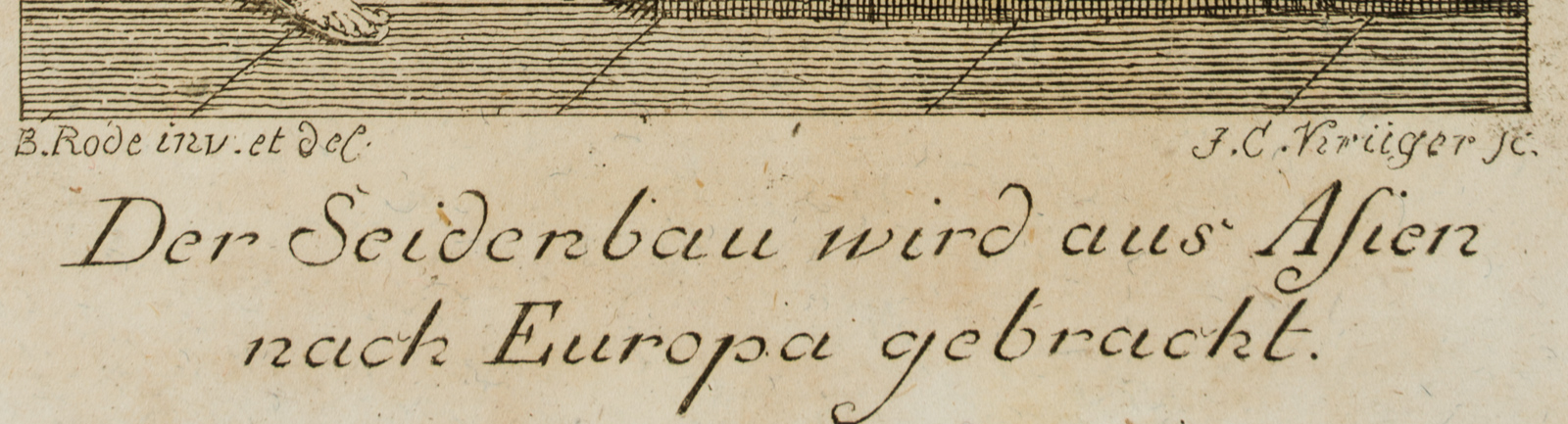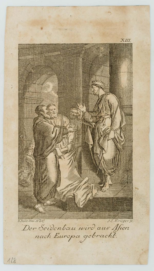 - Bezeichnung: Unterhalb der Darstellung links bezeichnet: “B. Rode inv: et del.” und “F. C. Krüger sc.”, darunter betitelt “Der Seidenbau wird aus Asien nach Europa gebracht.”; oben rechts nummeriert “XIII.”.