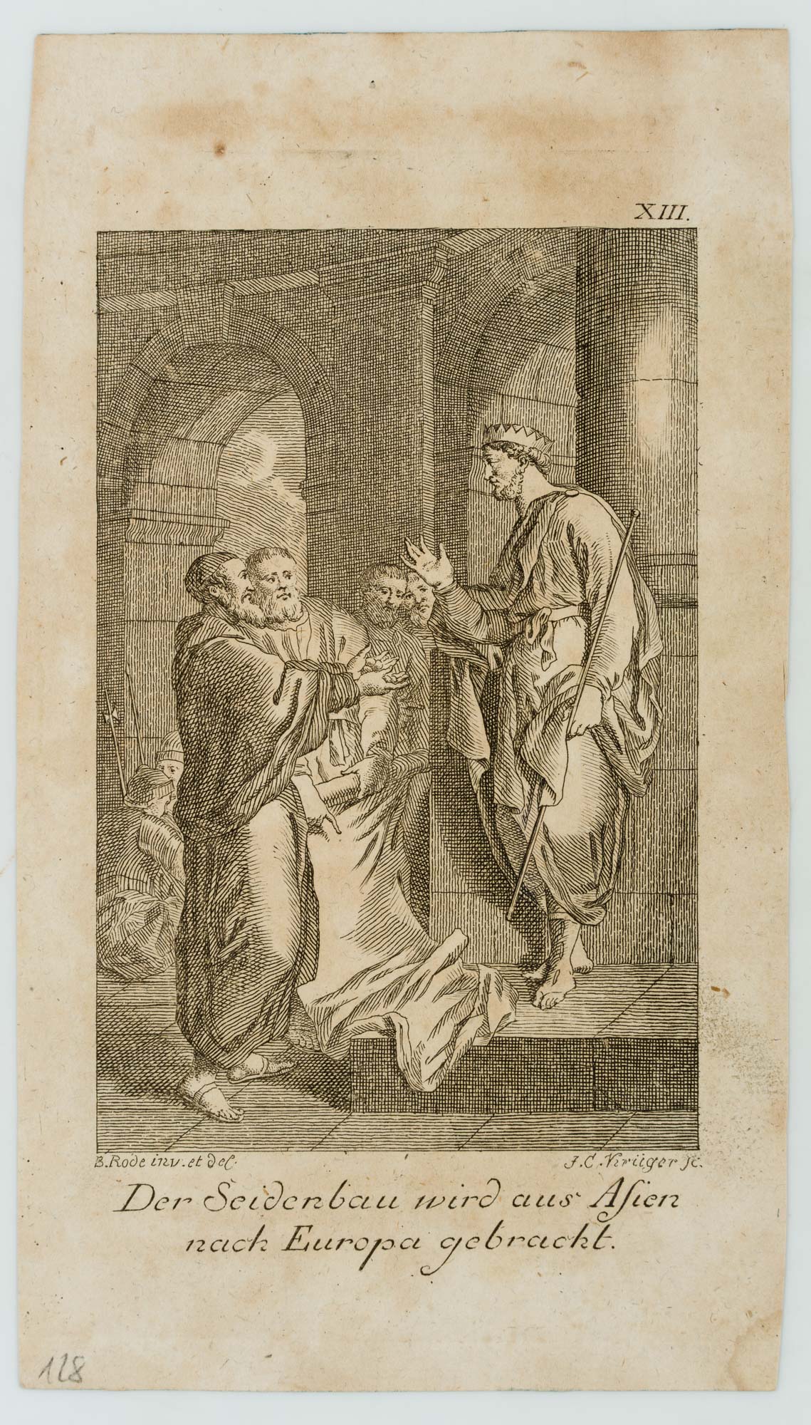 - Inscription: Inscribed below the image on the left: “B. Rode inv: et del.” and “F. C. Krüger sc.”, titled “Der Seidenbau wird aus Asien nach Europa gebracht.” below; numbered “XIII.” on the upper right.