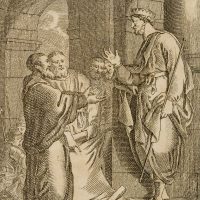 Johann Matthias Schröckh (1733 Wien – 1808 Wittenberg) war ein deutscher Historiker und Literaturwissenschaftler, Dichter und Arzt; Illustration zu Schröckhs “Allgemeiner Weltgeschichte für Kinder”, die er in vier Teilen von 1779 bis 1784 in Leipzig herausgegeben hatte. Er betrachtete seine “Weltgeschichte” als Art Lesebuch für Kinder mit Schilderungen aus der alten Geschichte, der Religionsgeschichte und der deutschen sowie europäischen Geschichte, die mit zahlreichen Kupferstichen nach Zeichnungen Bernhard Rodes illustriert wurden. Rodes Illustrationen belegen sehr schön seine Fähigkeit, besondere oder ungewöhnliche historische und literarische Themen bildlich umzusetzen, ohne dabei auf Vorbilder zurückgreifen zu können. - Datierung: 18. Jahrhundert