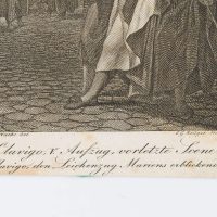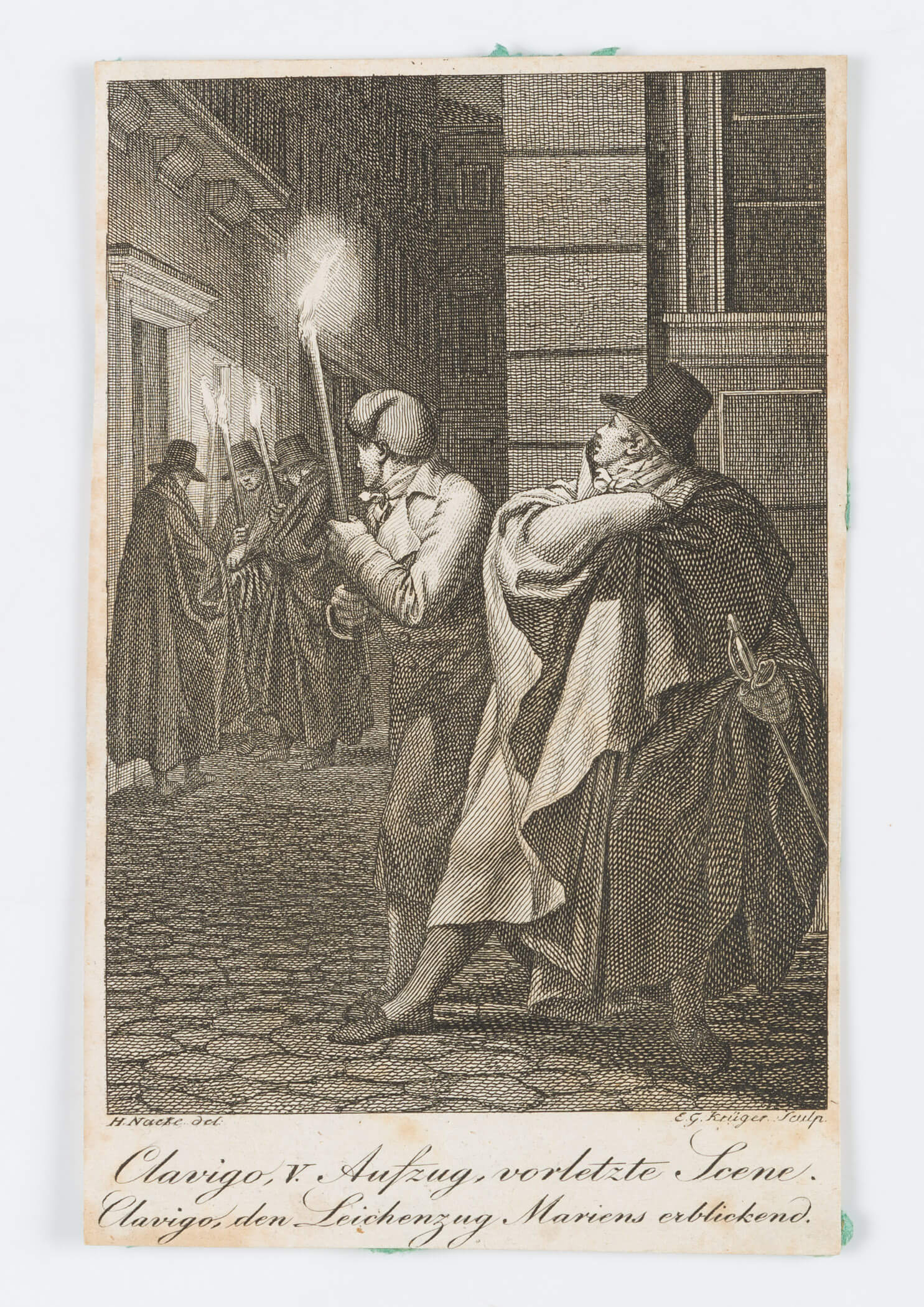 - Inscription: Lower middle signed in the printing plate: “H. Naeke del | E. G. Krüger”. Lower middle inscribed in the printing plate: “Clavigo V. Aufzug, vorletzte Scene. Clavigo, den Leichenzug Mariens erblickend”.