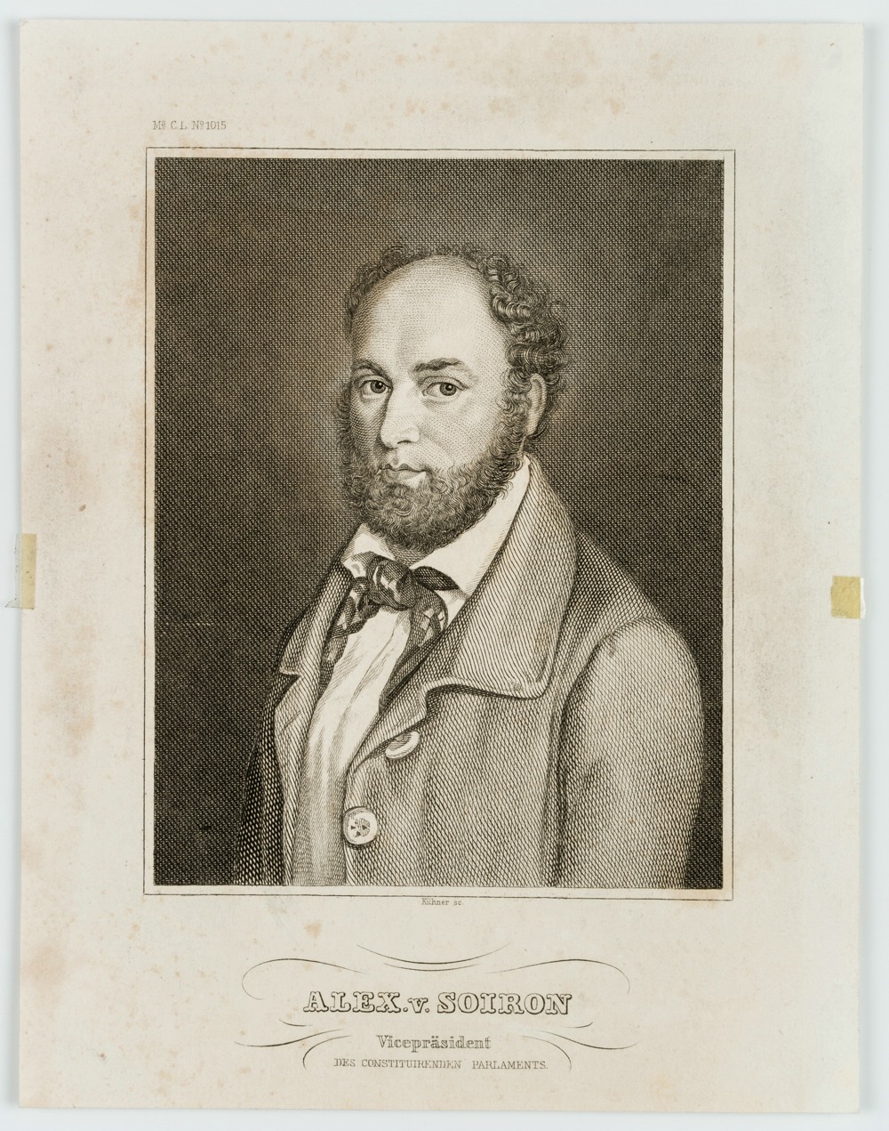 - Bezeichnung: Unterhalb der Darstellung signiert mit “Kühner sc.”, darunter mit dem Namen des Dargestellten “ALEX v. SOIRON Vicepräsident DES CONSTITUIRENDEN PARLAMENTS” bezeichnet.
