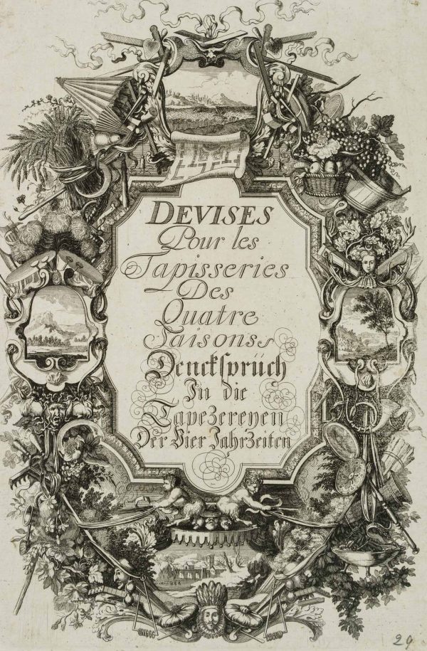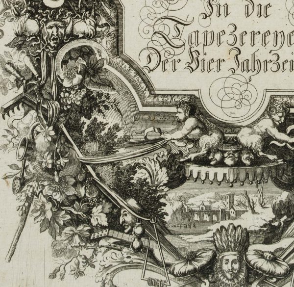 - Description: Splendid title page of the series “The Four Seasons”, J. S. Küsel; on the verso with collection number: “1031”. Titled in the centre of the richly decorated cartouche: “Devises Pour les Tapisseries Des Quatre Saisons. Dencksprüch In die Tapezereyen Der Vier JahrZeiten”. The lavish framing reveals all kinds of beautiful things besides the small depictions of a landscape in the four seasons; it also shows agricultural implements, ornaments in the form of tendrils as well as ornaments derived from plant forms, fruits, and a group of musical instruments. A sheaf and the mask in the centre of the lower section also attract attention.