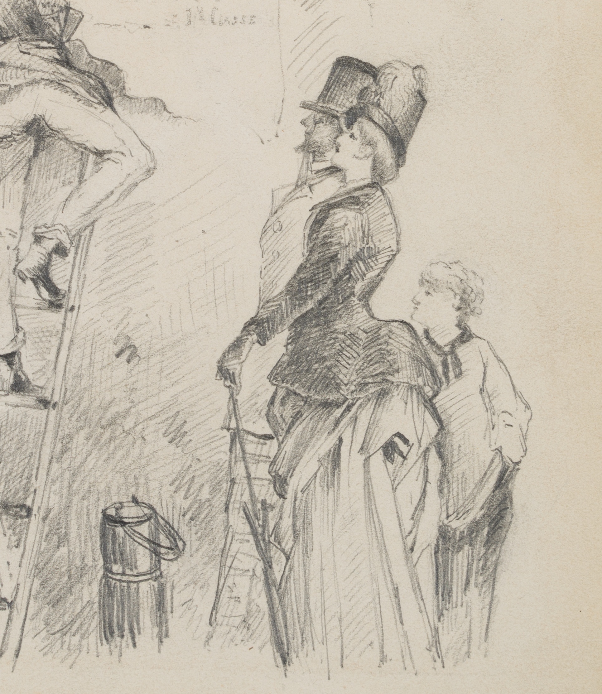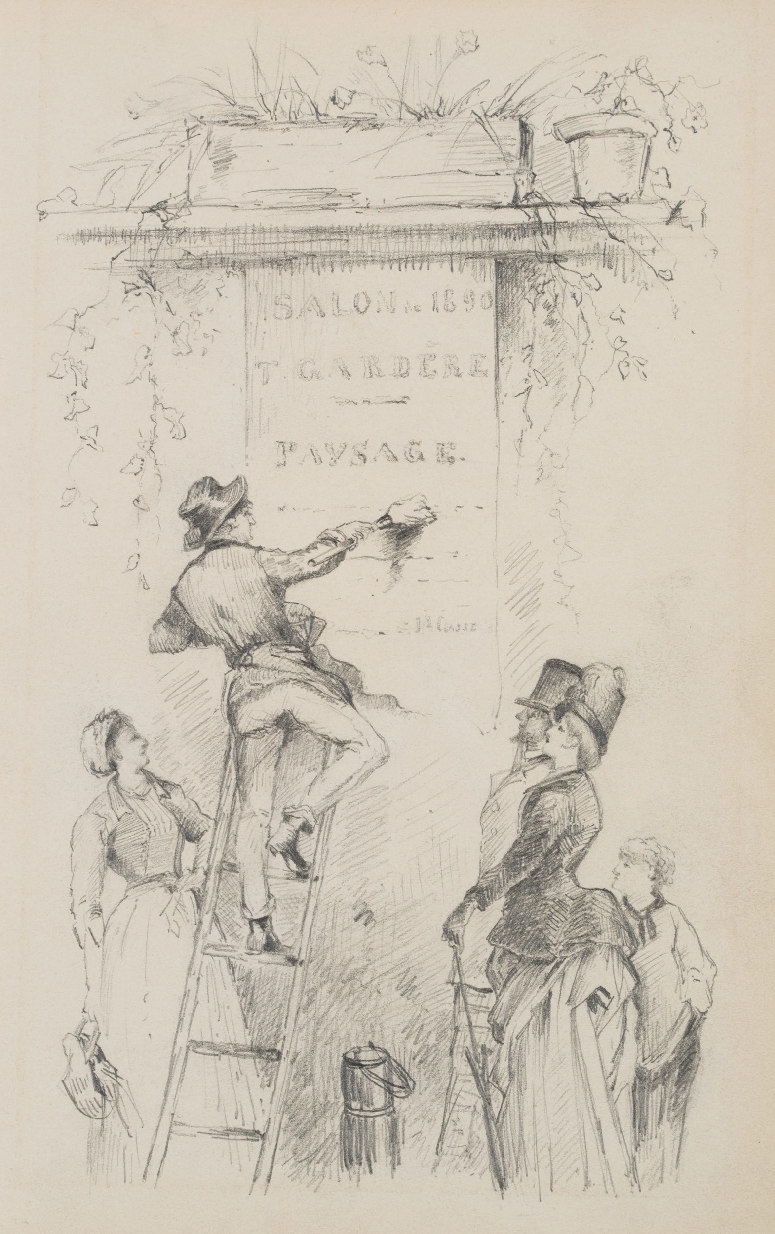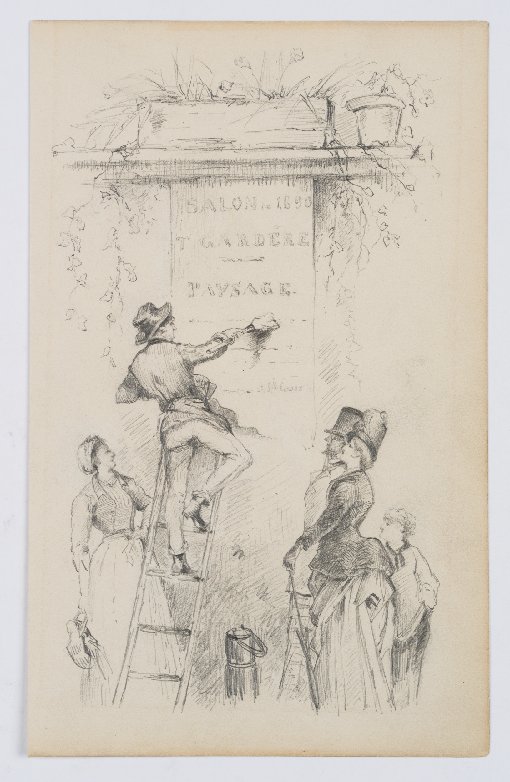 - Description: Standing on a ladder, a young man spreads the sticker of an advertisement for the Salon de 1890. A maid and a bourgeois couple with a child look up at him and read the advertisement curiously.