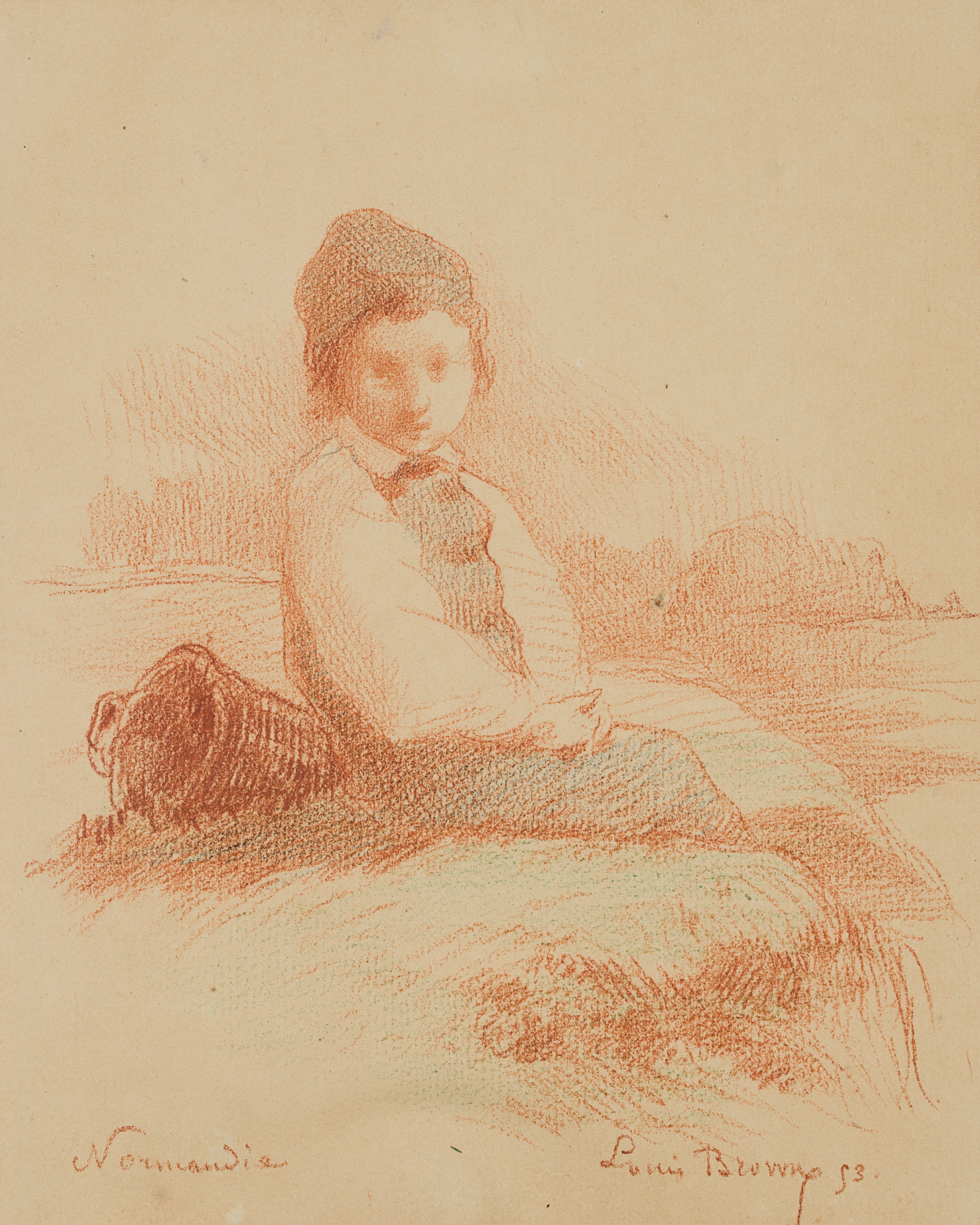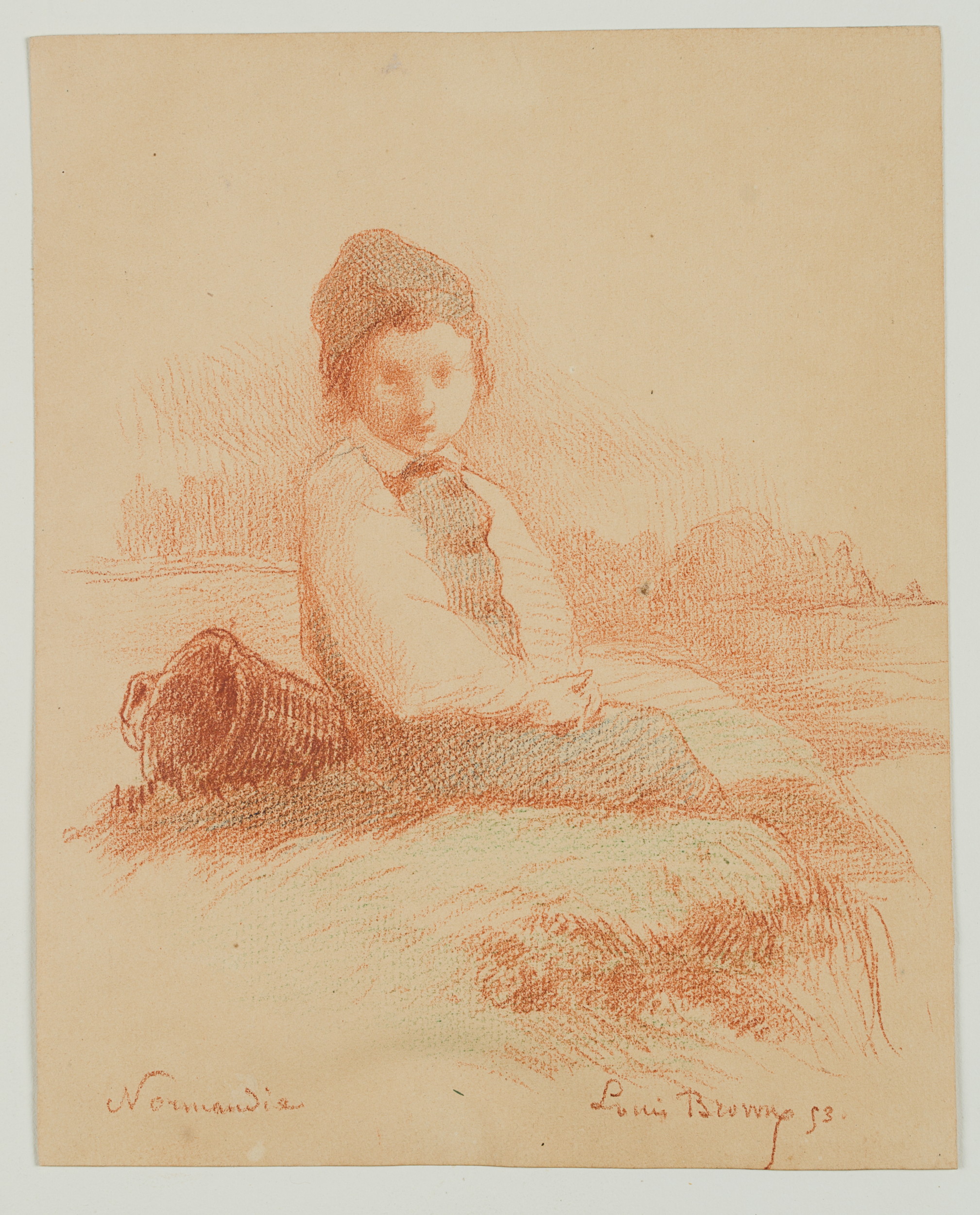 Louis Browne (19. Jahrhundert), Knabe am Strand sitzend, Normandie, 1853, Rötel