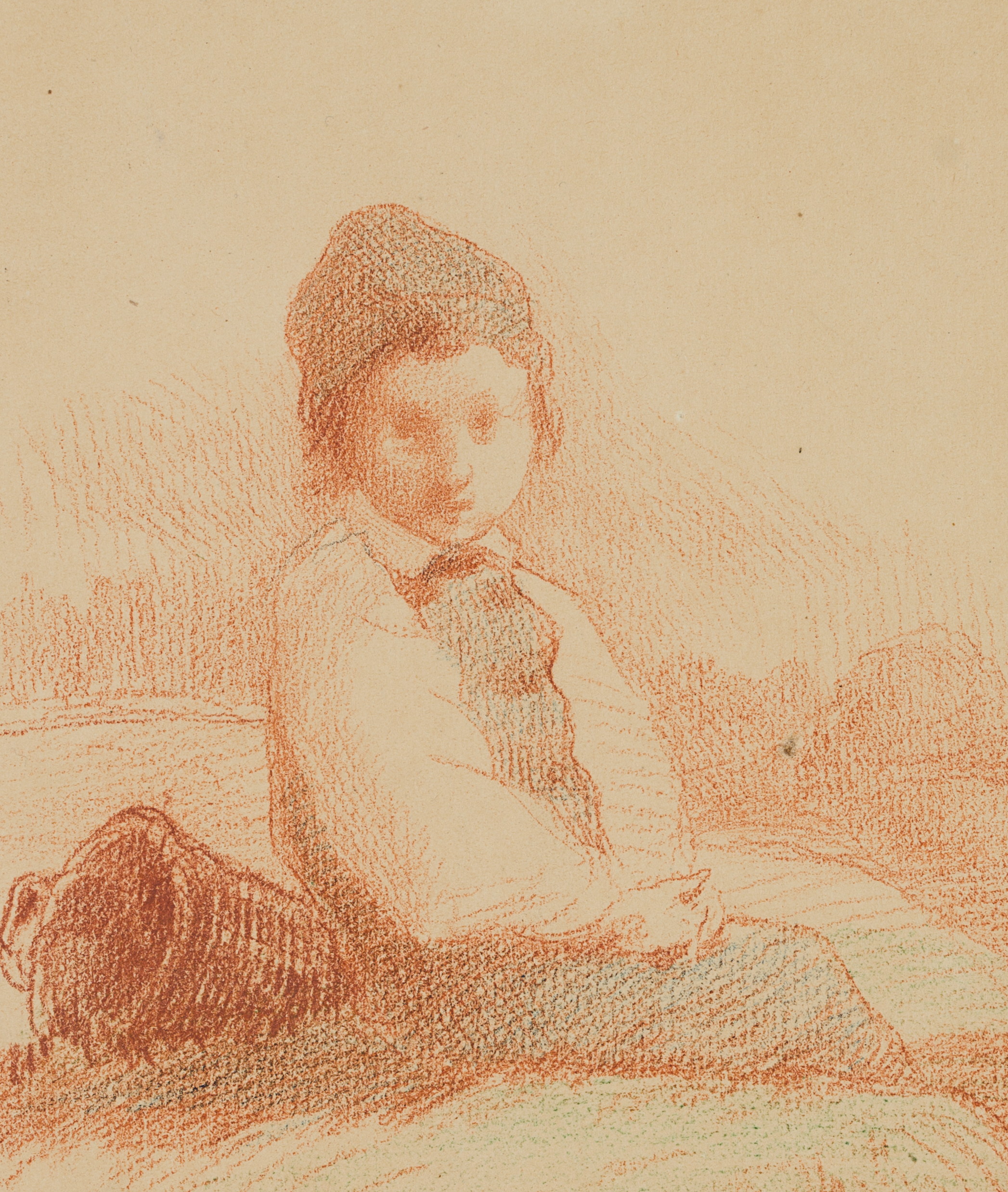 Louis Browne (19th century), Boy sitting on the beach, Normandy, 1853, Red chalk drawing