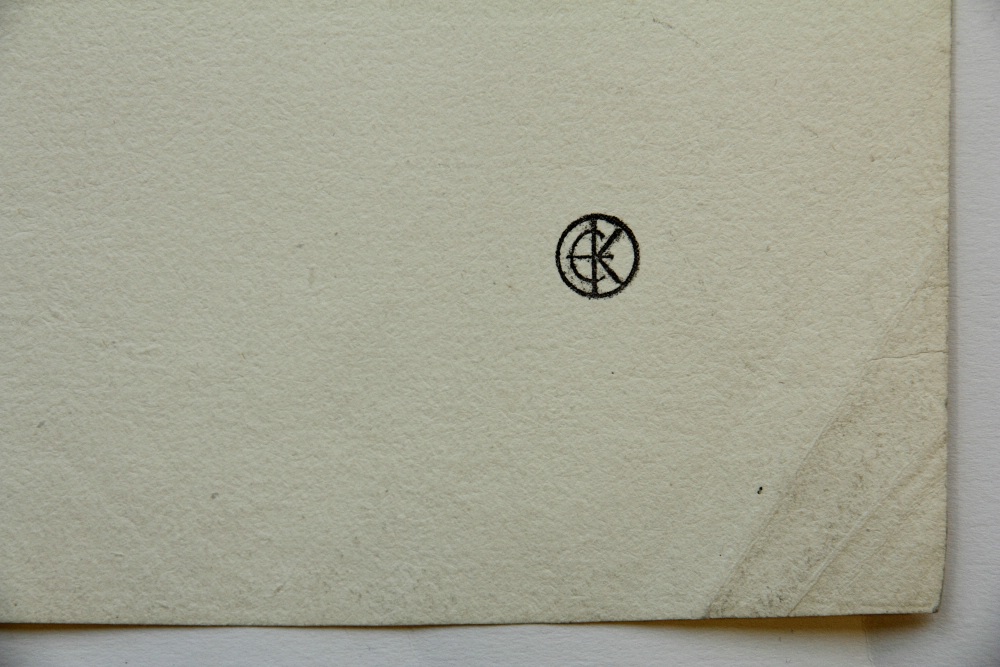 - Inscription: Below the image in printing plate artistically provided with the name of the sitter and signed by the artist. On the reverse is a collection stamp with the monogram “EK”.