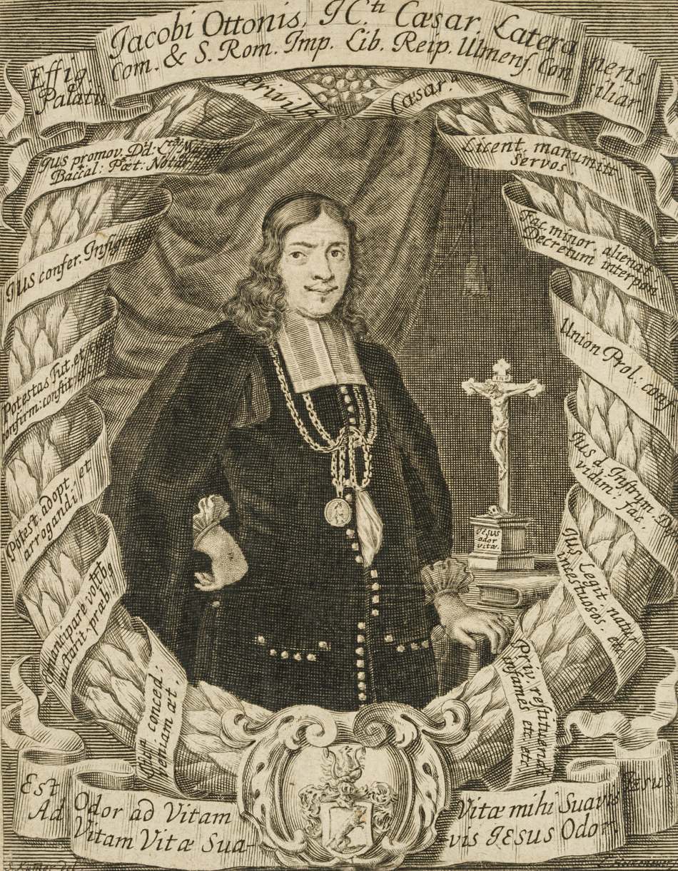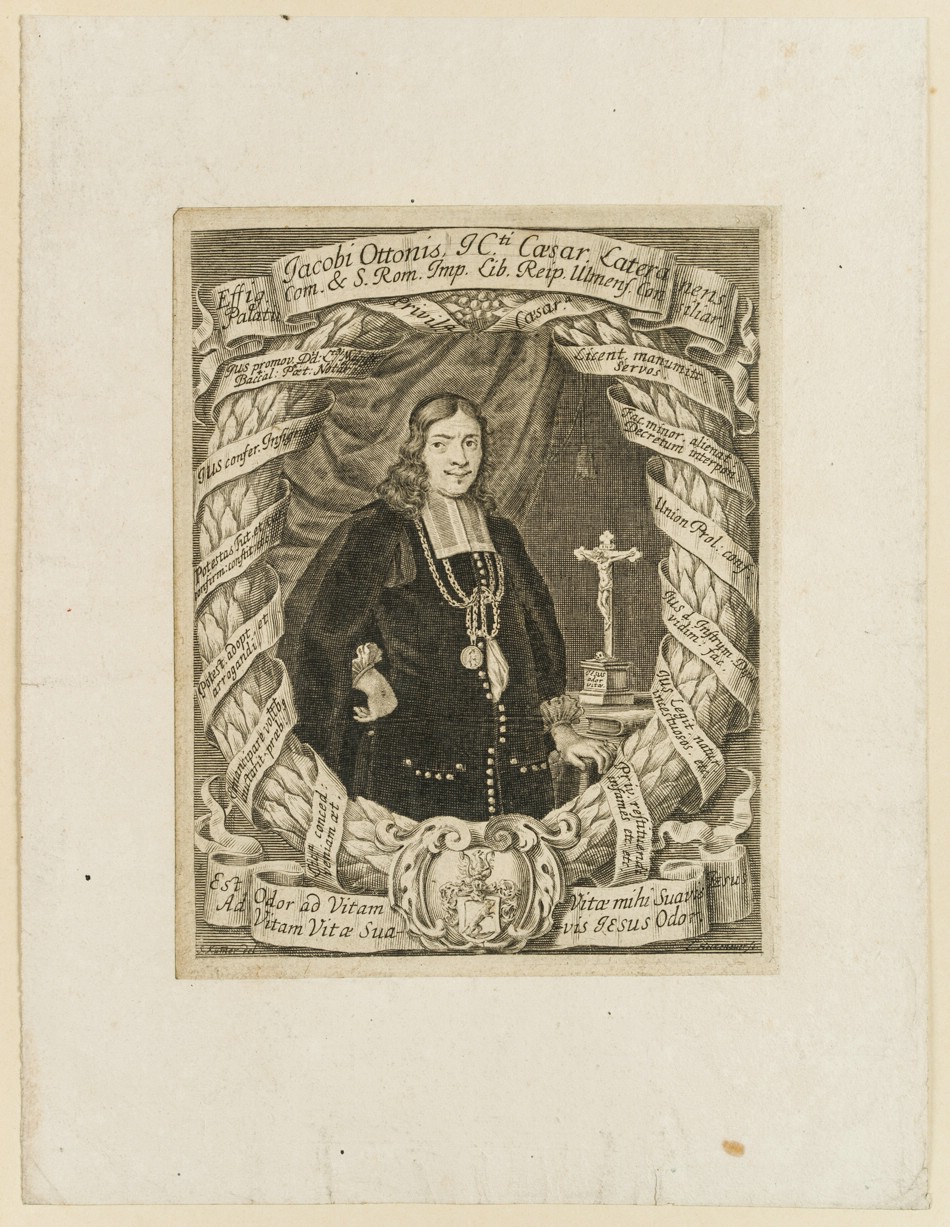 auf altem Papier aufgezogen Nach einer Vorlage von Bartholomäus Sixtus Kummer (um 1647 – 1697 Ulm). Halbfiguriges Porträt im Halbprofil des Geistlichen, neben einem Kruzifix stehend. In der Darstellung bezeichnet mit: “Effig. Jacobi Ottonis, Icti Caesar. Lateranens. Palatii Com. & S. Rom. Imp. Lib. Reip. Ulmens. Consiliar. [.]”.