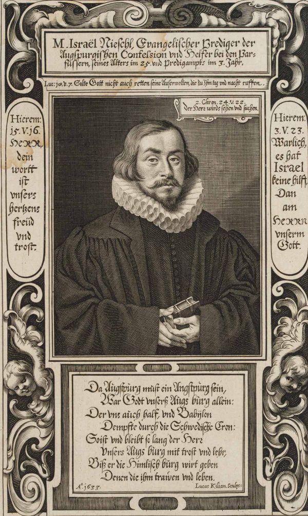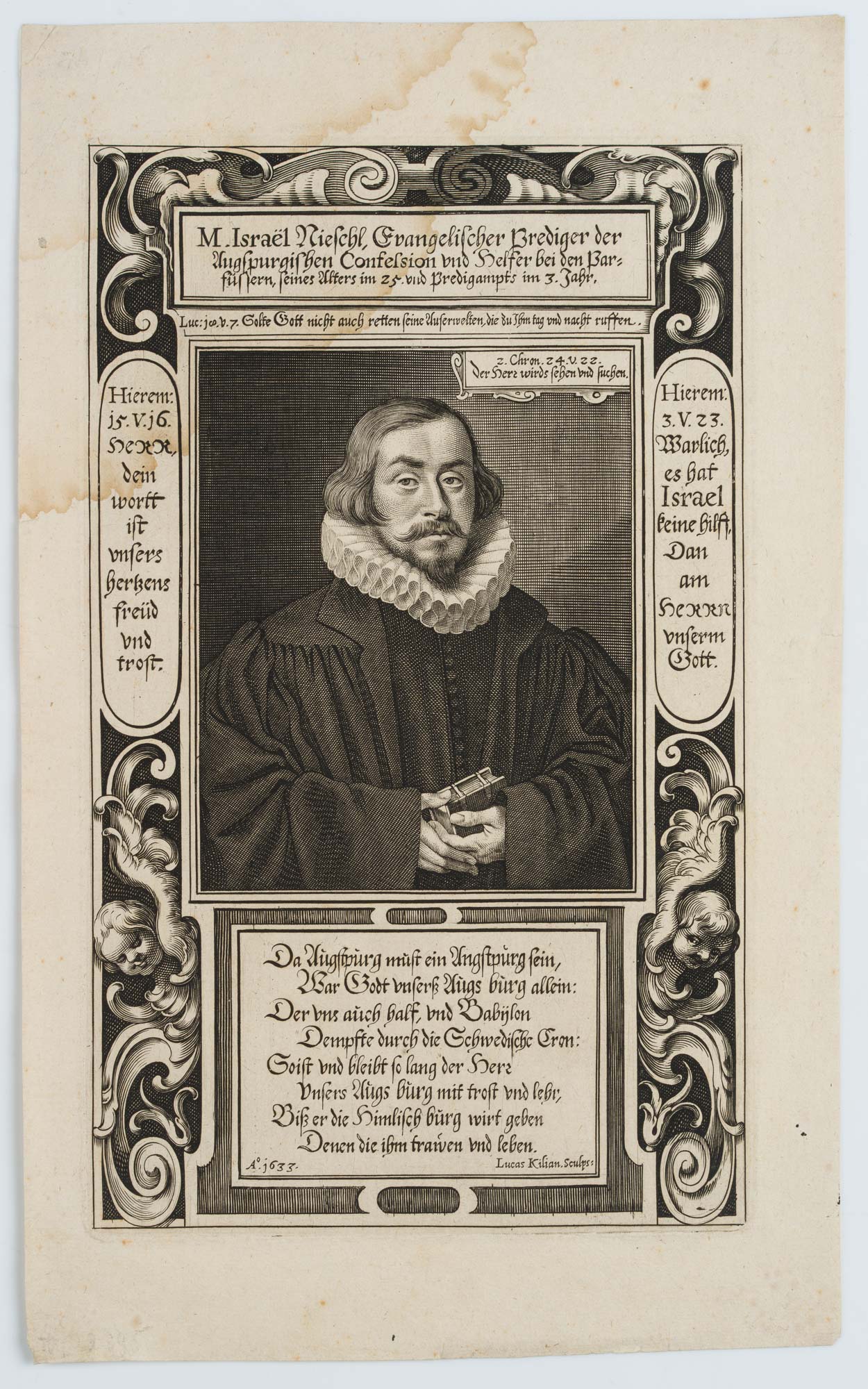 - Beschreibung: Israel Nieschel war 1632 Diakon an der Barfüßerkiche in Augsburg. Oberhalb mit Angaben zum Dargestellten beschriftet, unterhalb mit religiös erbaulichen Versen, darunter signiert und datiert. Mit ornamentaler Umrandung