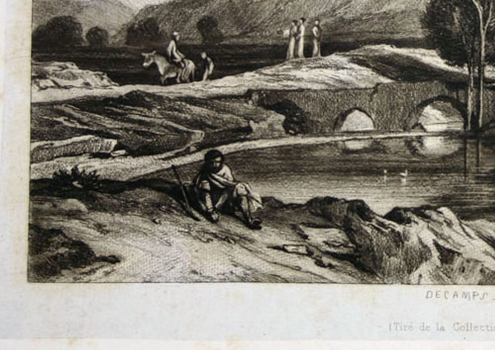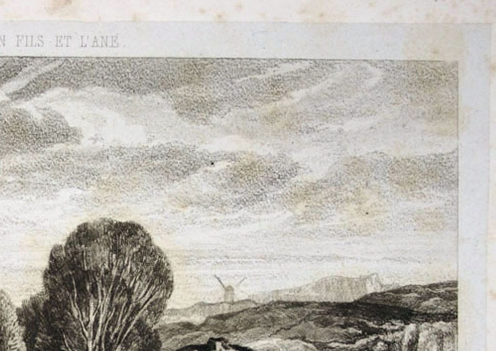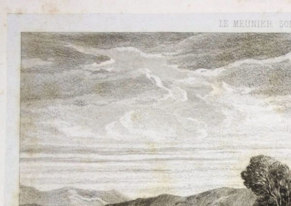 - Description: Lithograph by Louis Marvy, inscribed top center: “Le Meunier son fils et l`ane”, bezeichent bottom center: “Decamps Louise Marvy (Tiré de la Collection de Mr. P. Perier). Idyllic hilly landscape with river and windmill. A stone arched bridge and dilapidated walls by the river testify to an old cultural landscape. Staffage figures, including a miller with his son and a donkey, enliven the lovely nature. Louis Marvy (Jouy 1815 – 1850) was a French illustrator, engraver and etcher.