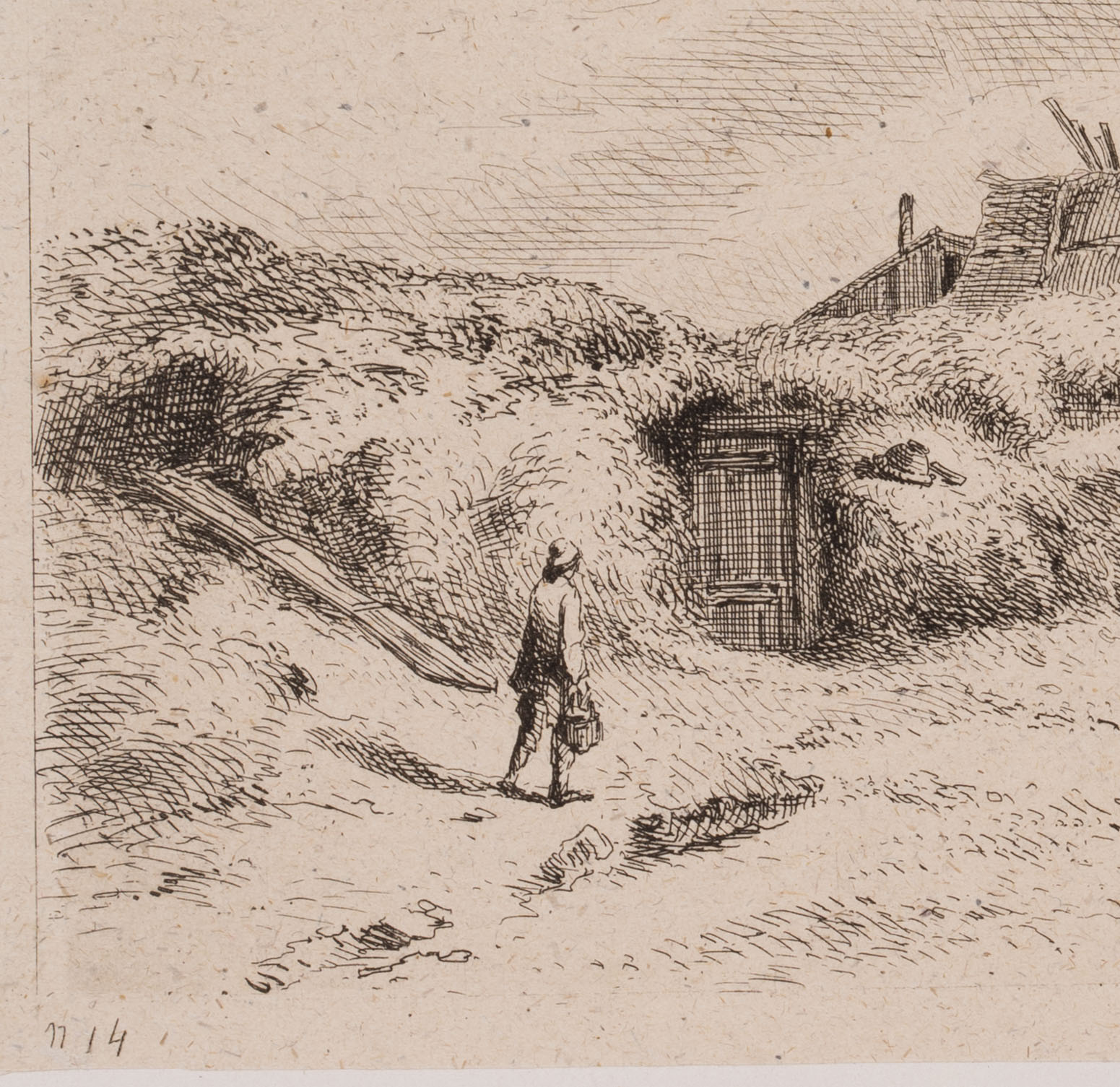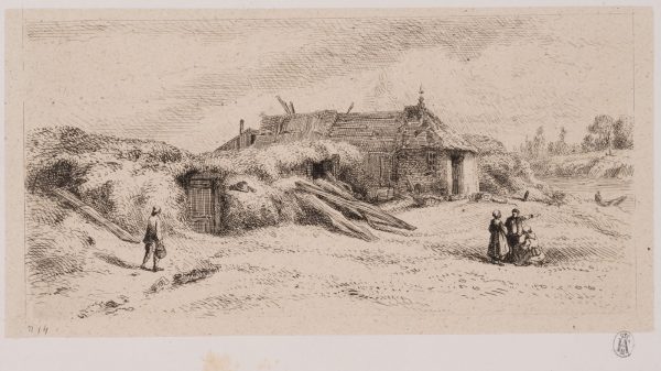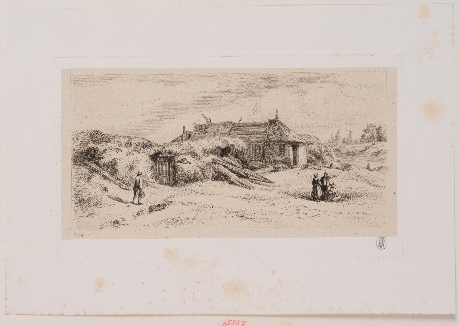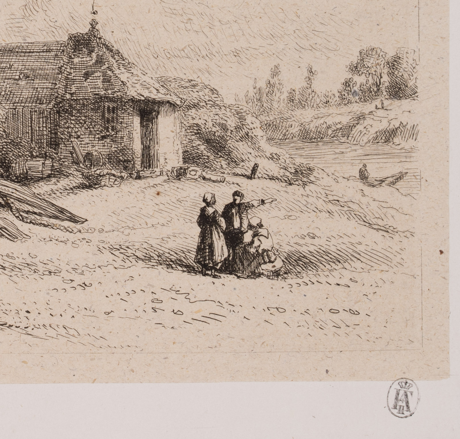 Louis Marvy (19th century), Landscape with farmers at a fishing hut by the river, c. 1844, Etching