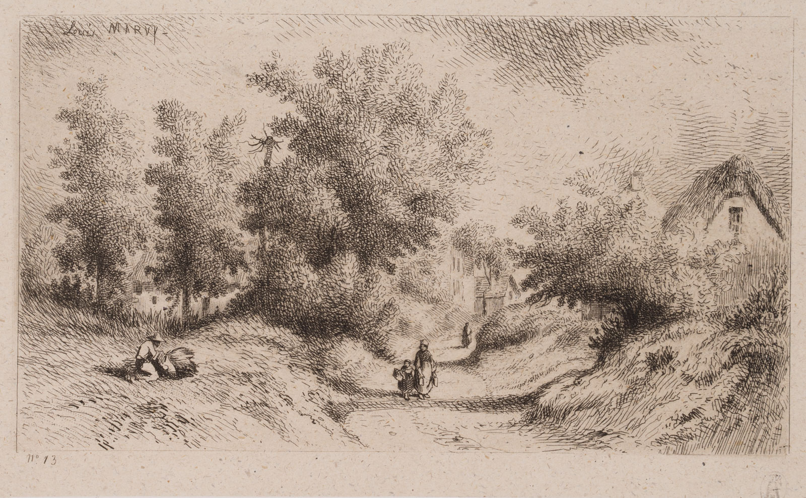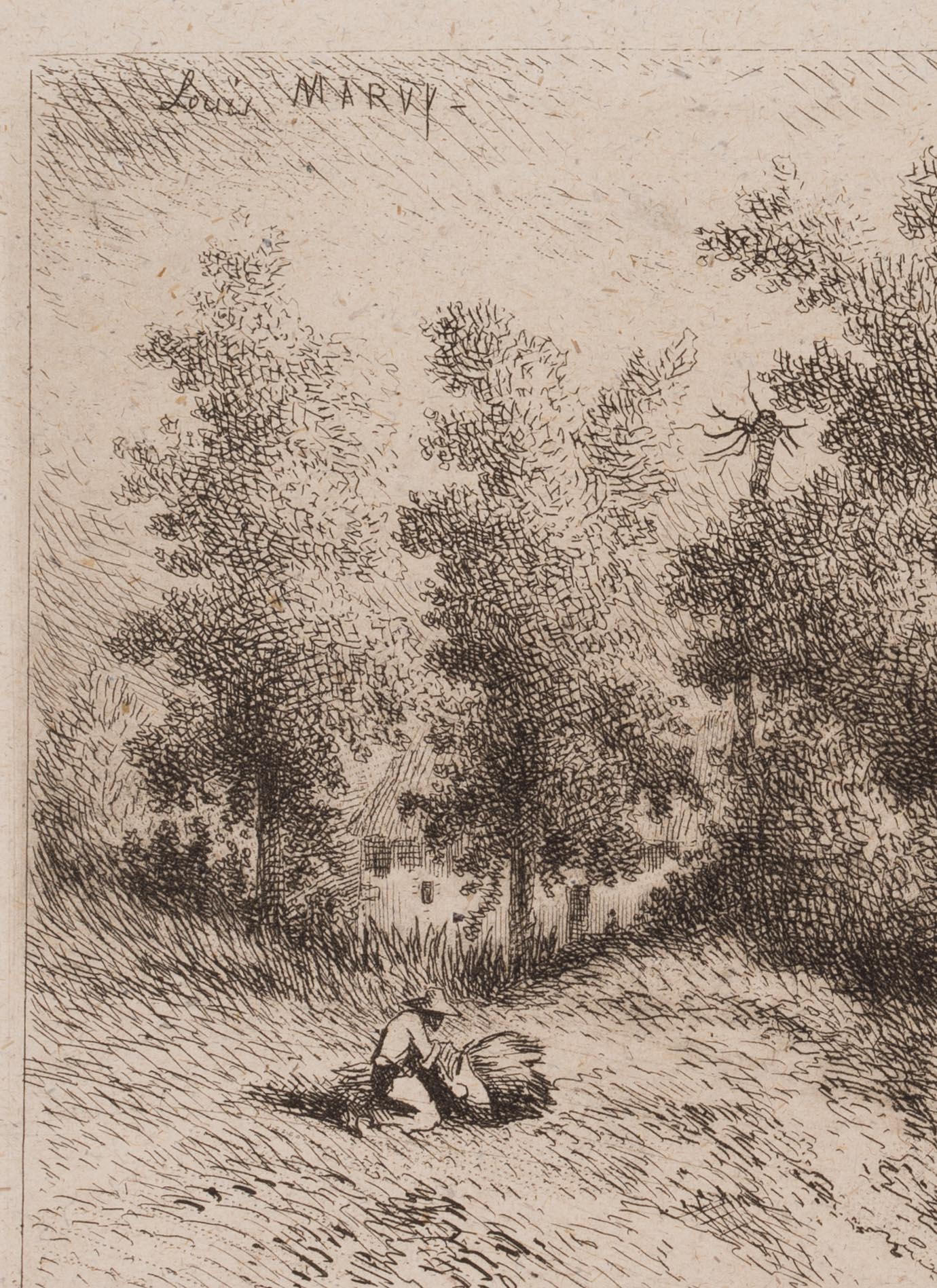Louis Marvy (19th century), In the countryside with farmers harvesting hay and a village in the background, c. 1844, Etching
