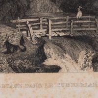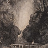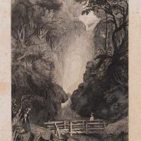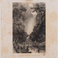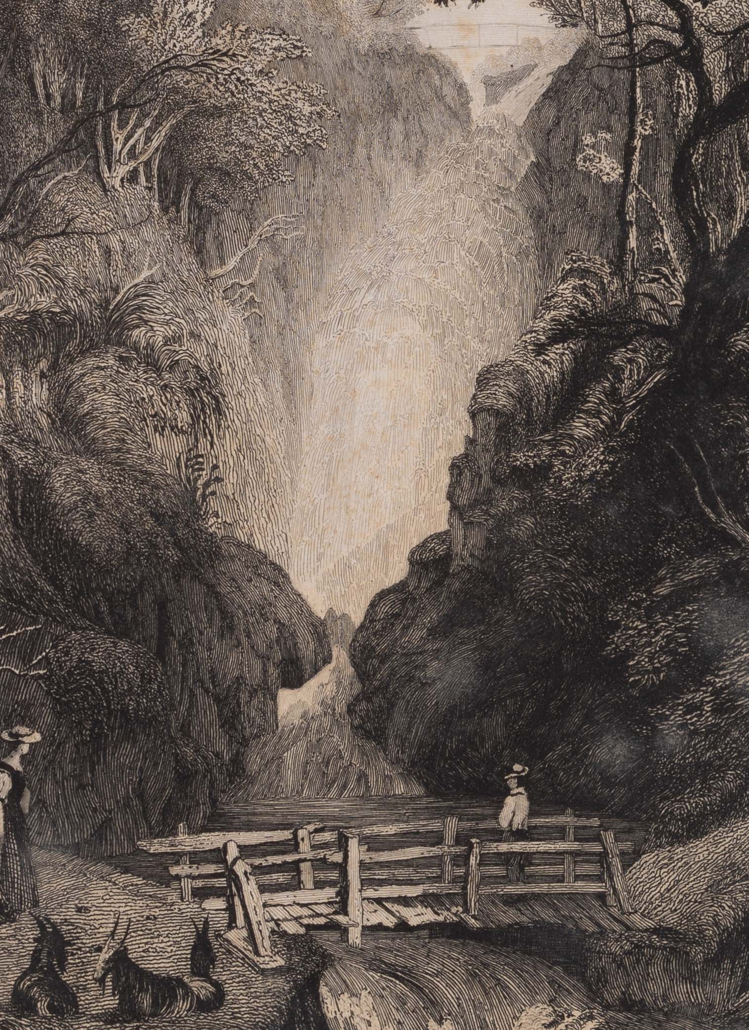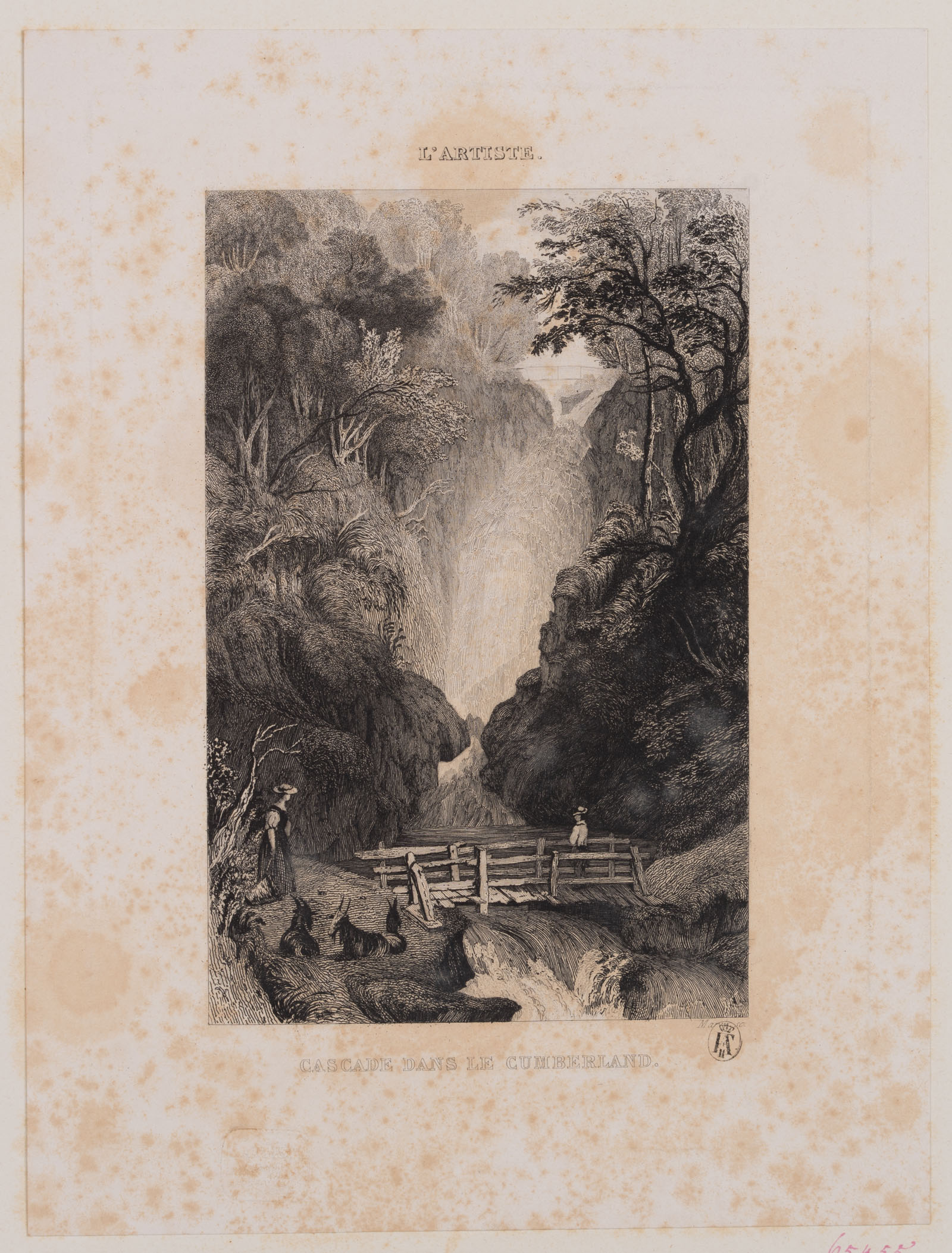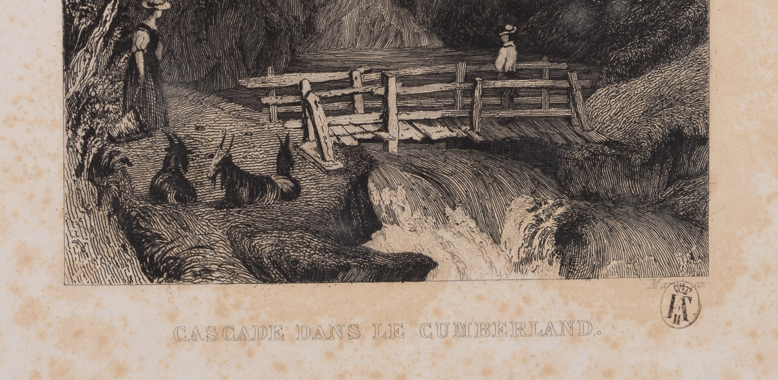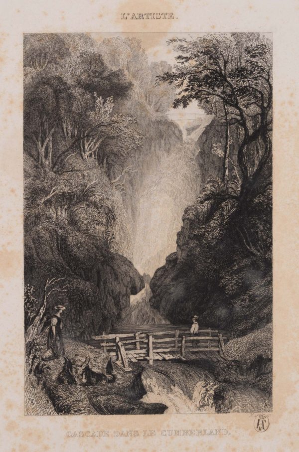 Louis Marvy (19th century), “Cascade dans le Cumberland” with visitors next to and on the bridge over the raging waterfall, 19th century, Etching