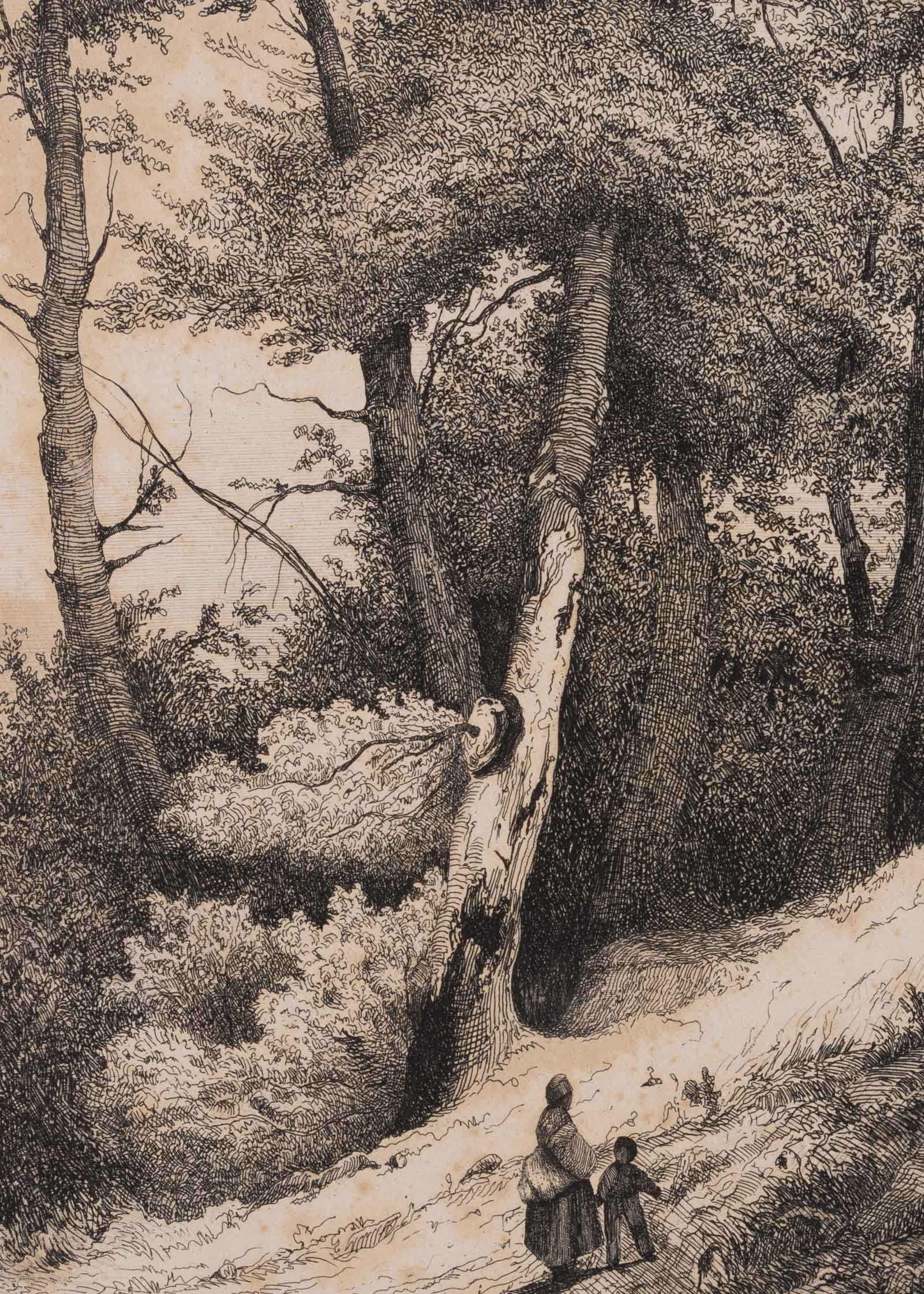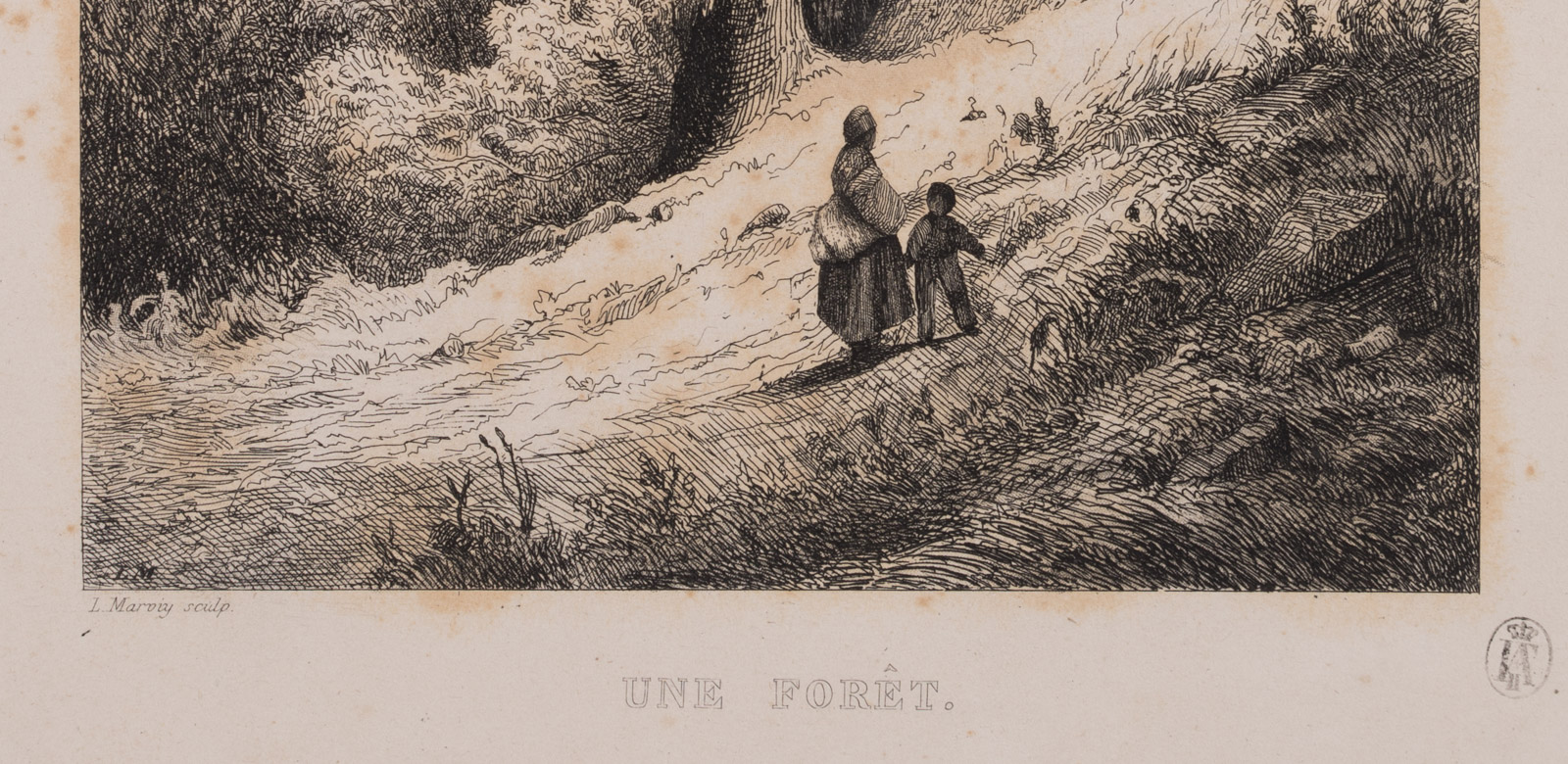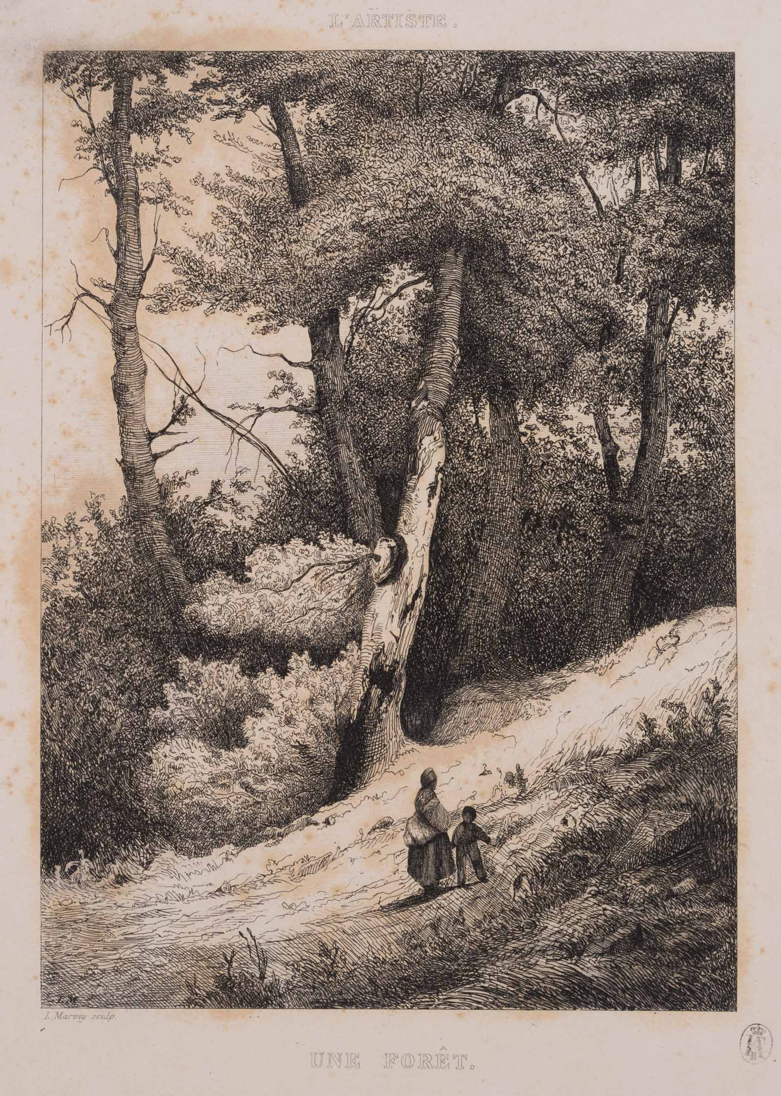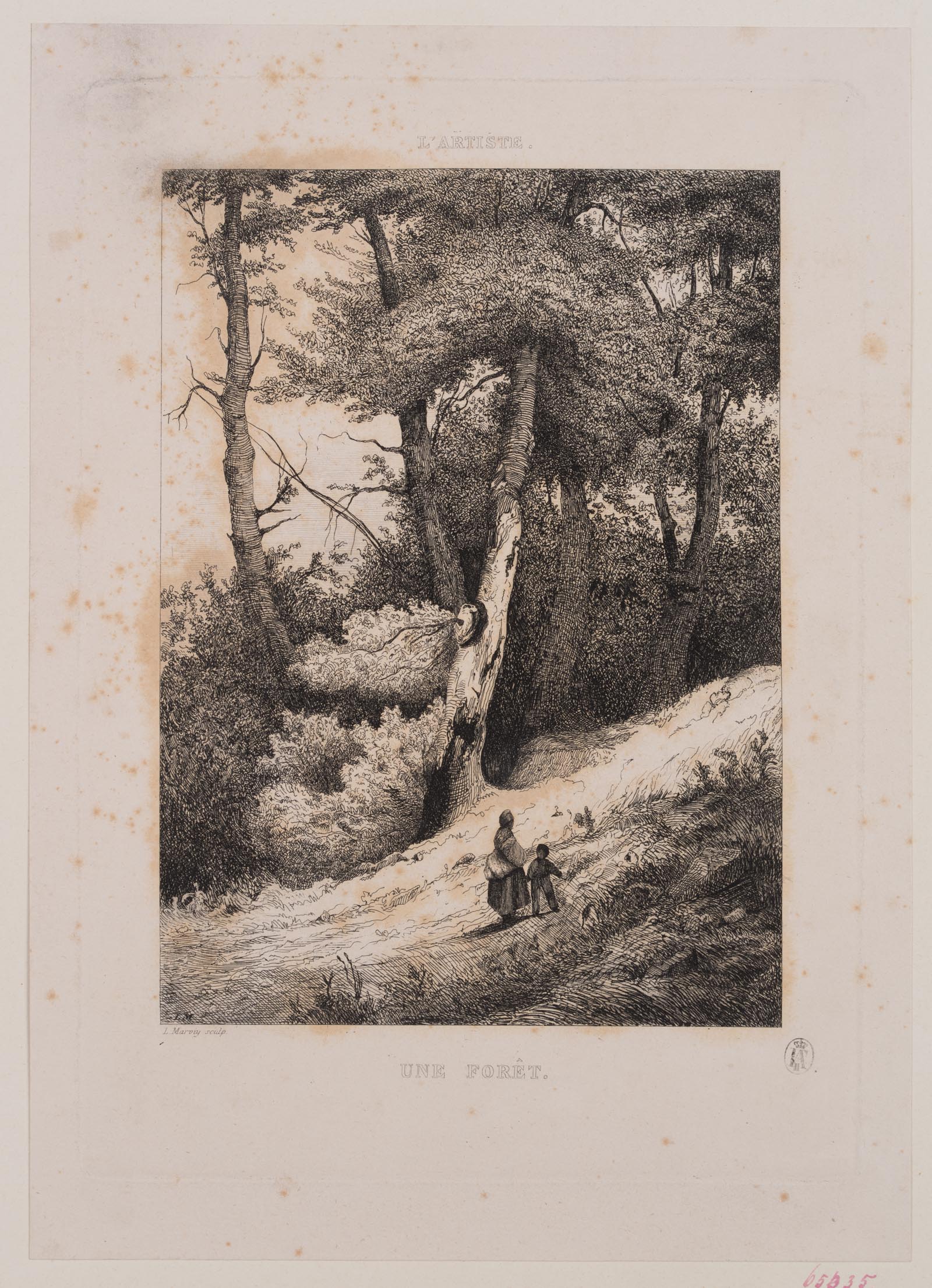 Louis Marvy (19th century), “Une foret” – Forest walk with mother and child climbing a slope with tall strong trees, 19th century, Etching