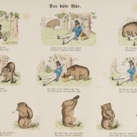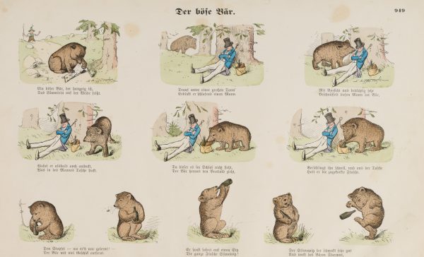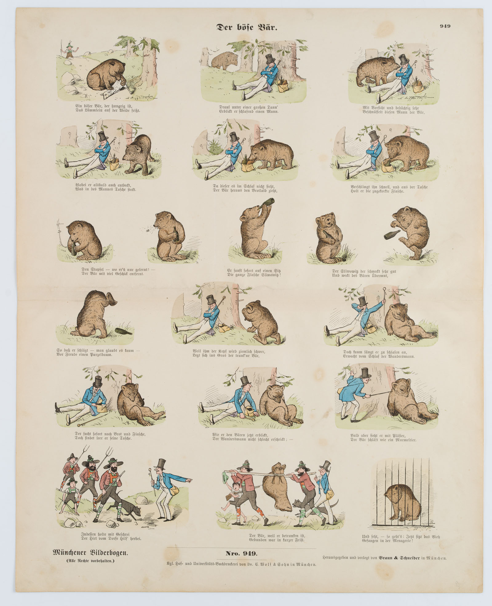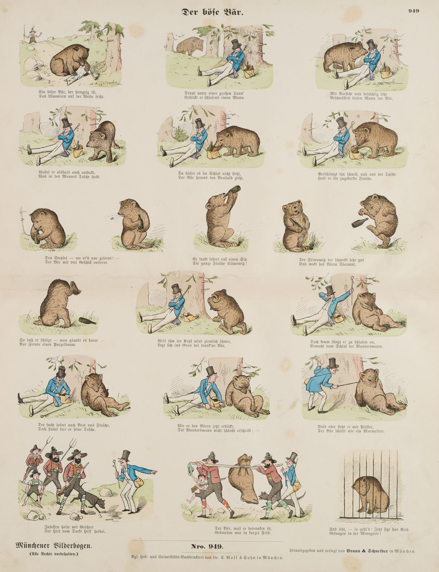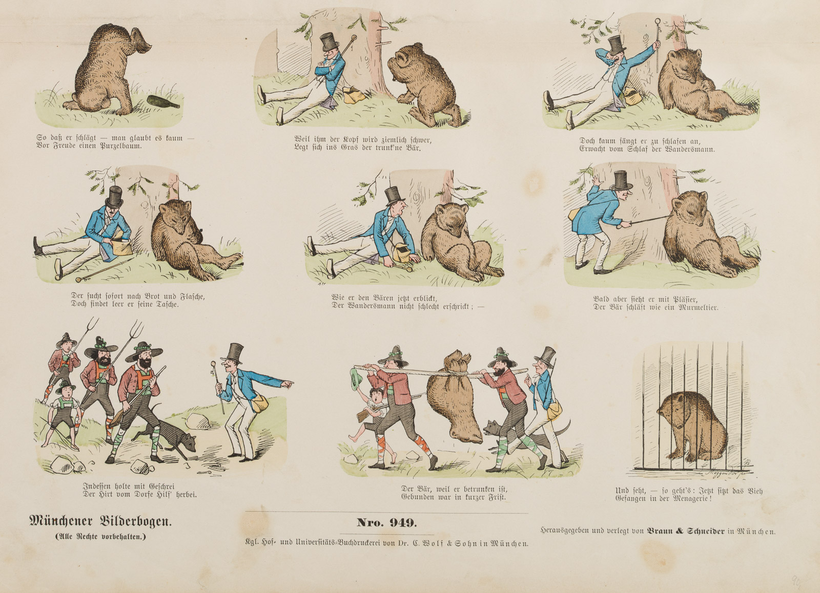 Lothar Meggendorfer (1847 – 1925 ), MEGGENDORFER, “Der böse Bär”, Münchener Bilderbogen No 949, 19. Jahrhundert, Holzschnitt