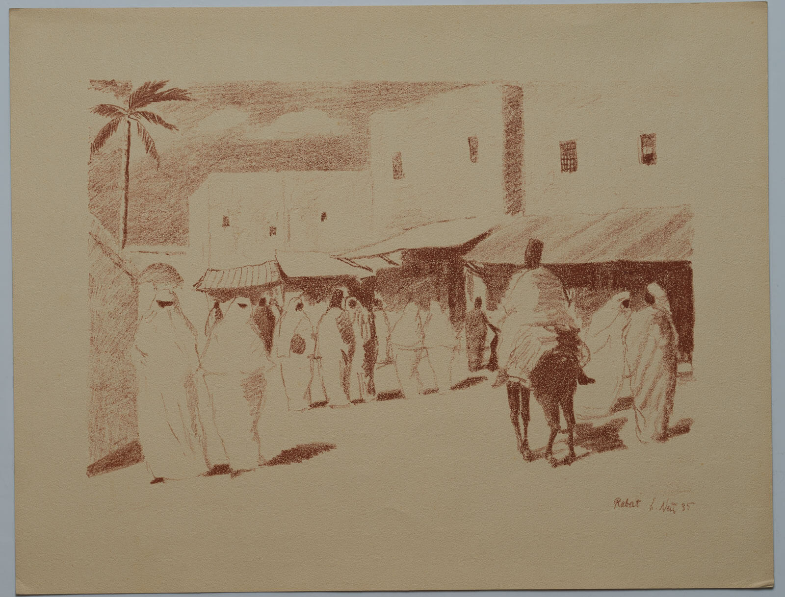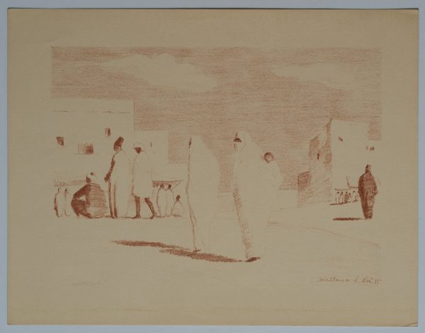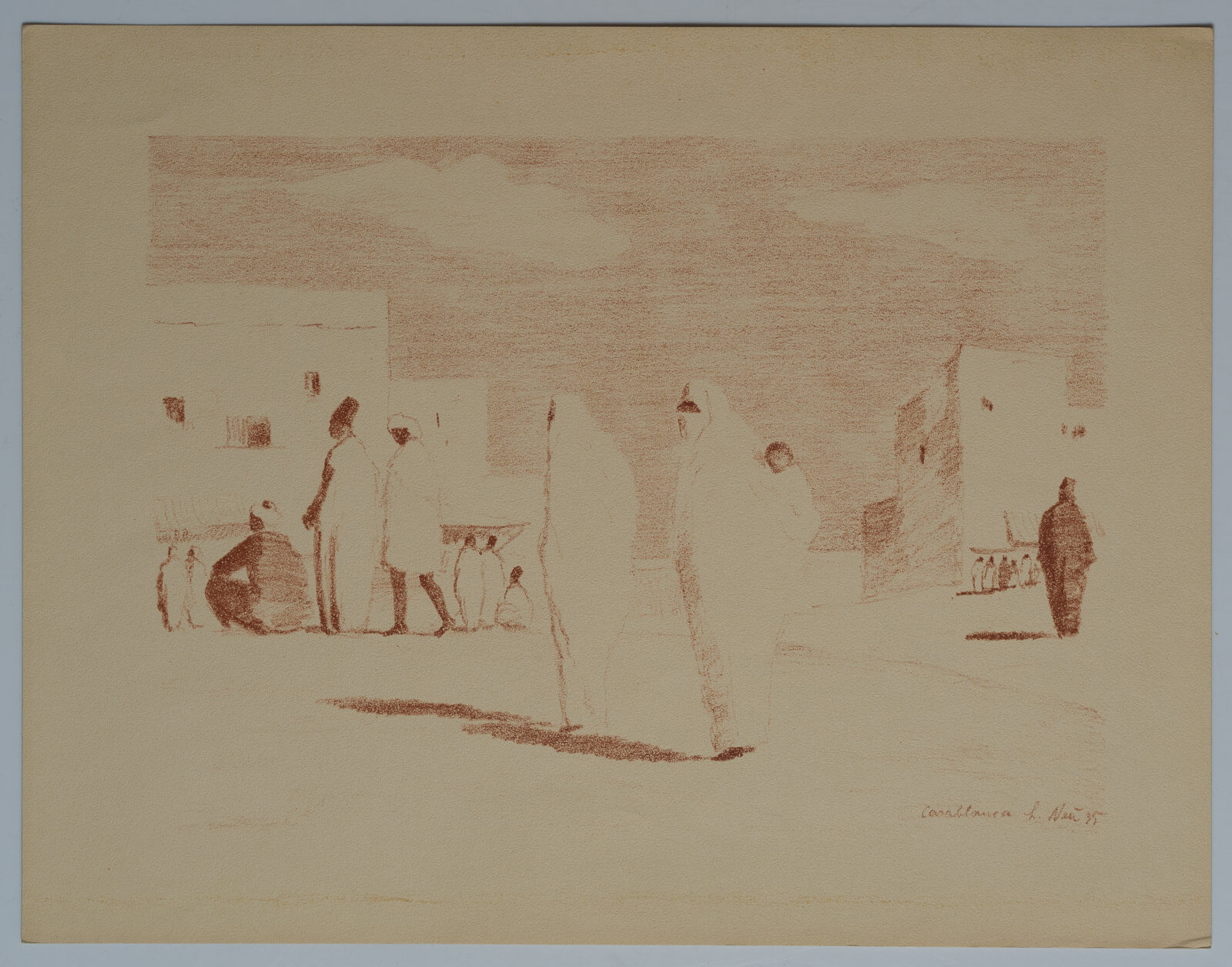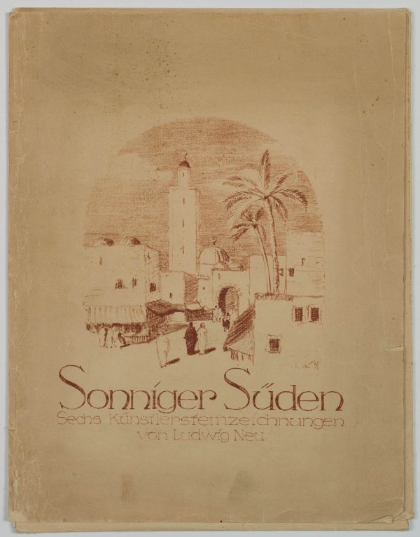 - Beschreibung: Originale Mappe mit drei der urprünglich sechs enthaltenen Zeichnungen. Auf der Mappe Darstellung eines orientalischen Straßenzugs mit Moschee und Passanten. Enthält folgende Darstellungen: Schiffe am Hafen von Lissabon, Menschen auf den Staßen von Casablanca, Menschen auf den Staßen von Rabat.