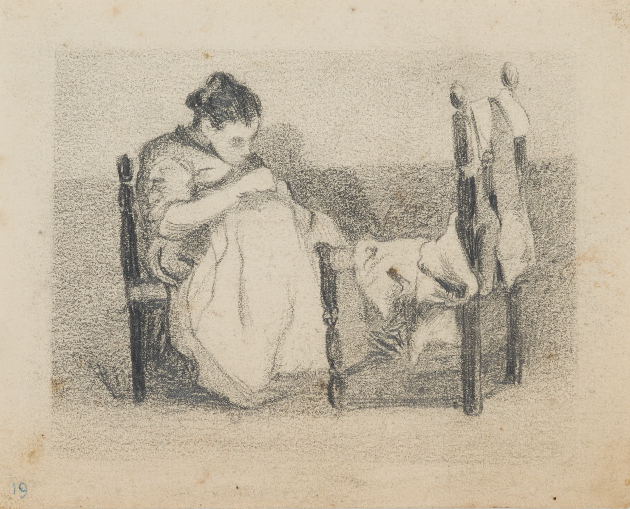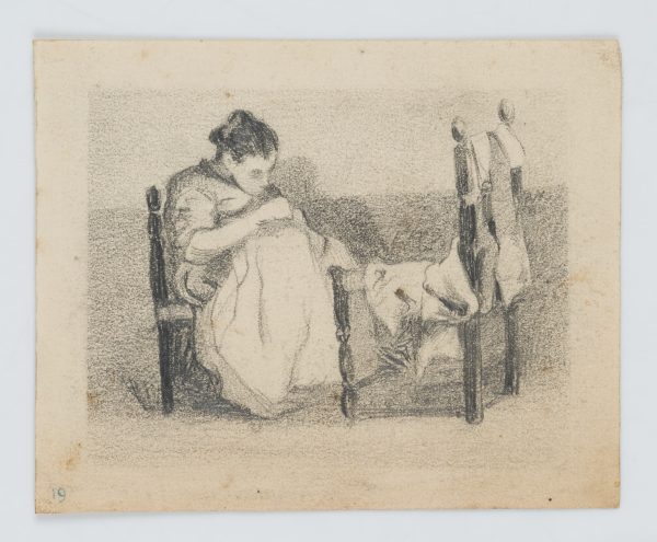 Leo Primavesi (1871 Köln – nach 1937 ), Bückelchen beim Nähen, 1894, Bleistift