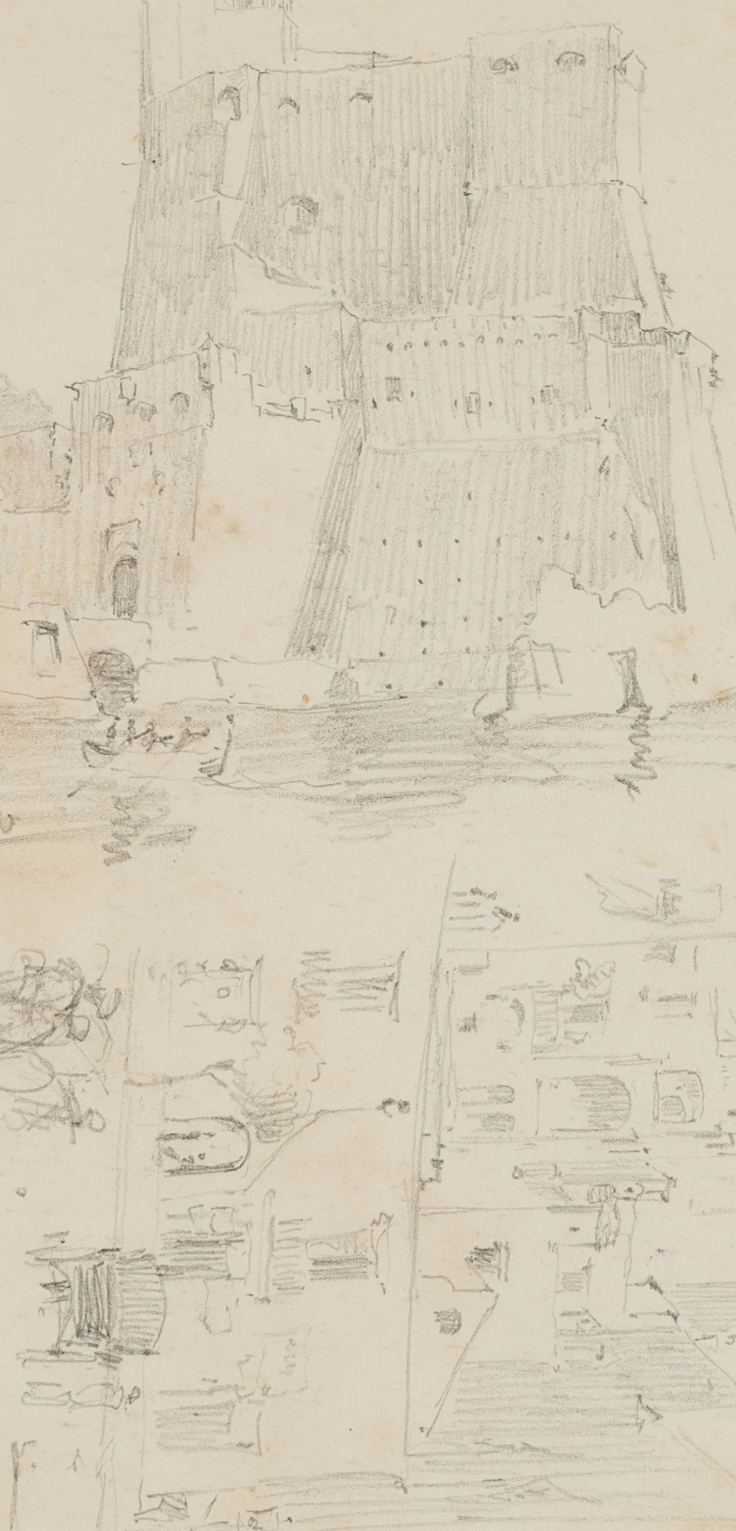 - Description: View of the fortress of Megaride Island in Naples. Below, another sketch of a street view.