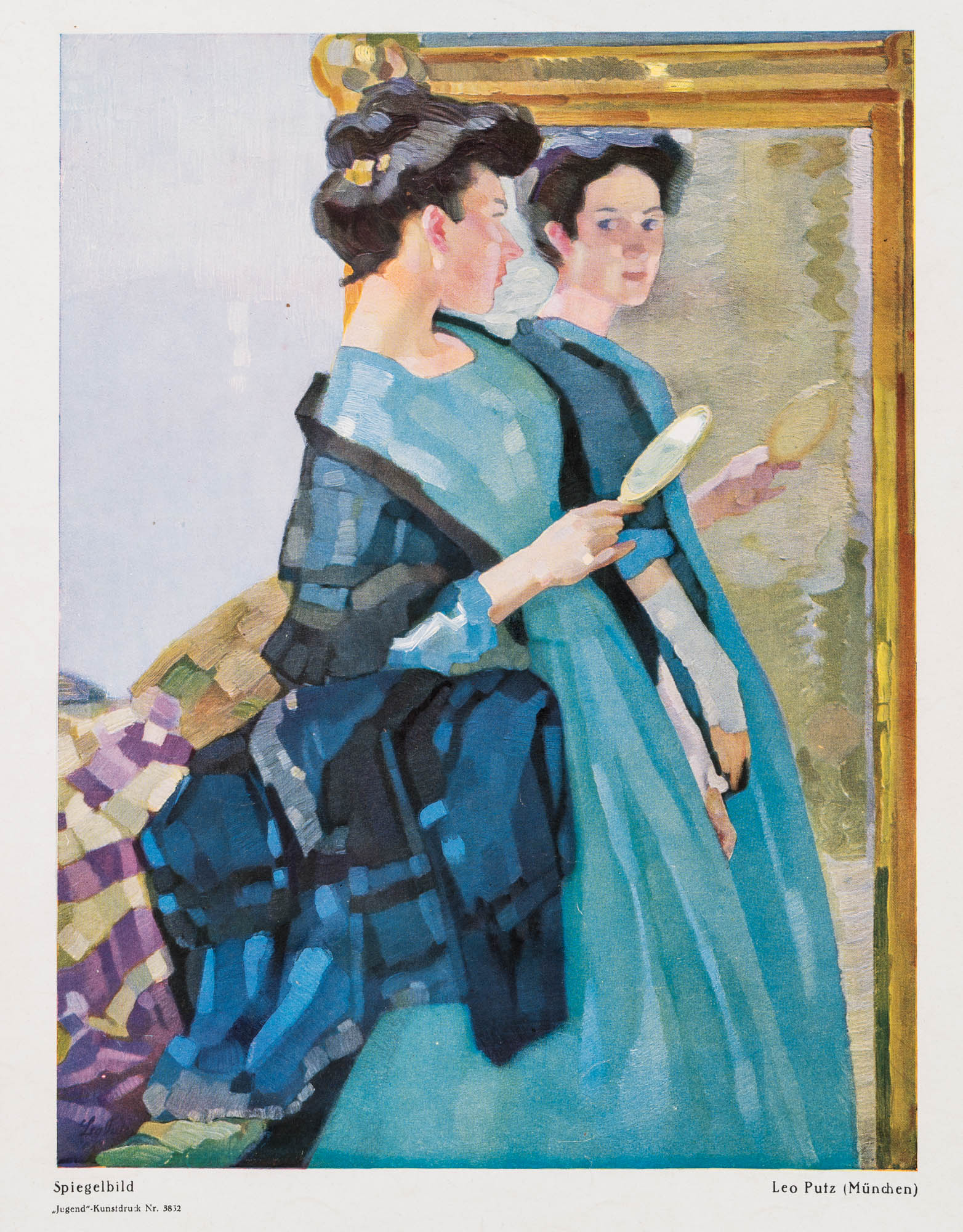 Leo Putz (1869 Meran – 1940 ebd.), Spiegelbild, Damenporträt vor dem Spiegel, aus dem Magazin ‘Jugend’, Kunstdruck Nr. 3832, um 1900, Reproduktion