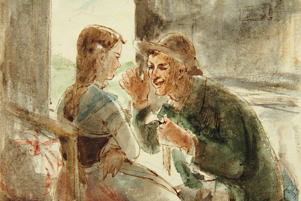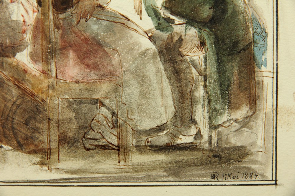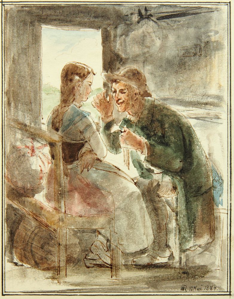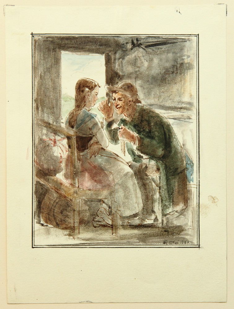 - Description: Ludwig RACH (*1853 Hattersheim – c. 1933), Joking old man with young maid in parlour, 1884, watercolour pen-and-ink drawing. Description: Watercolour pen-and-ink drawing in brown ink on paper. Signed at lower right in the image with the monogram of the artist and dated May 1884. On the reverse is a stamp with the initials “G+W D”, probably belonging to the graphic collection of Dr. Wilhelm Denzel.