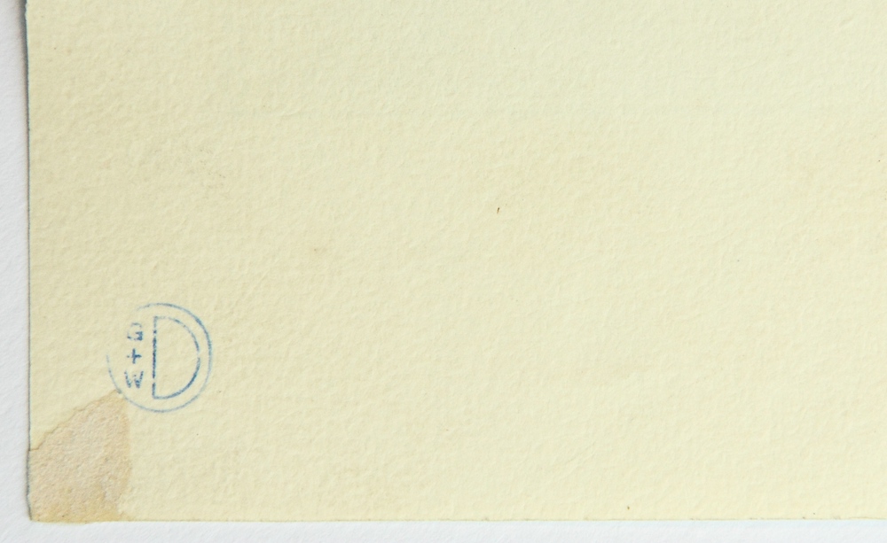 - Bezeichnung: Unten rechts in der Darstellung mit dem Monogramm des Künstlers signiert und auf Mai 1884 datiert. Rückseitig befindet sich ein Stempel mit den Initialen “G+W D”, der wohl zu der Grafiksammlung Dr. Wilhelm Denzel gehört.