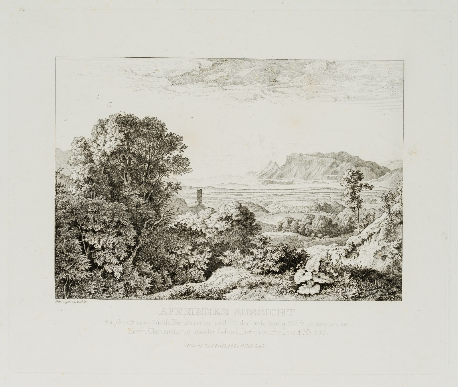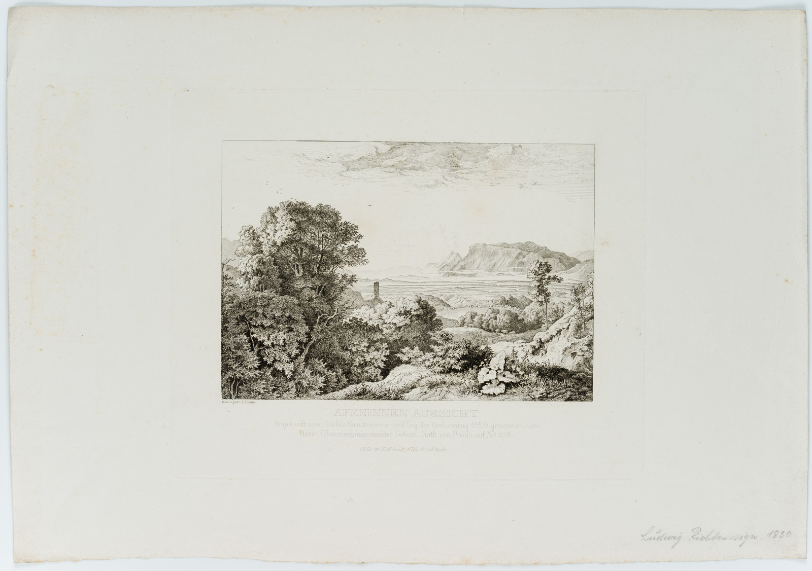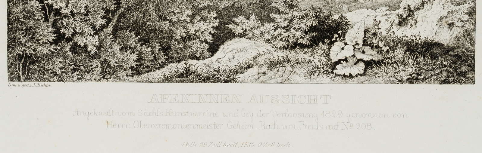 - Description: inscribed on the left below the depiction “Gem. u. gest. v. L. Richter”, named “Apeninnen Aussicht/Angekauft vom Sachs. Kunstvereine und bey der Verloosung 1820 gewonnen von Herrn Oberceremonienmeister Geheim_Rath von Preuss auf No.208”.